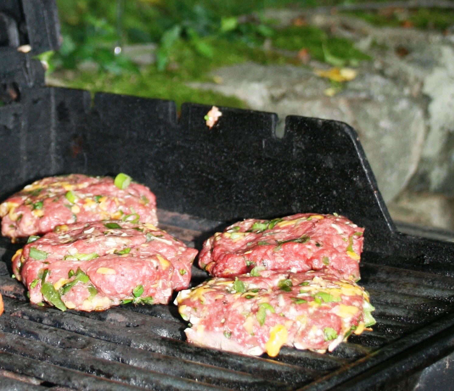 Combine ingredients together into 4 patties. Heat grill on high and cook to liking. For us that is medium and takes approximately 8 minutes total, flipping every 2 minutes to avoid burning.