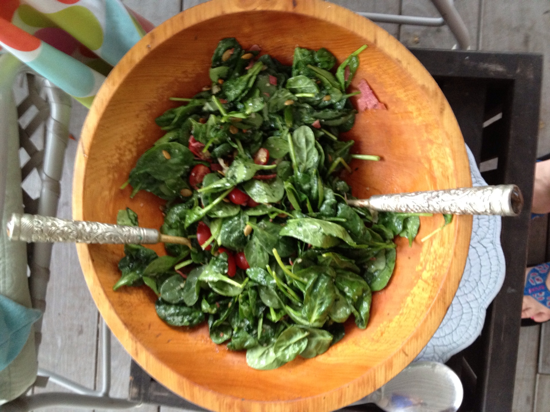 Saturday morning I created a “jalepeno spiked egg scramble.” I’d deliberately chopped extra cilantro, jalepeno and green onion on Friday night so there was little prep involved as I rubbed my tired eyes on Saturday morning. We found the egg scramble precisely what was needed to fortify the fam (or at least mom and dad) for a morning hike in Pound Ridge. The sour cream gave it an added richness and the jalepeno (with a little coffee) was the perfect thing to get the endorphins flowing. The kids were demanding turkey bacon, and I’ve been interested in experimenting with grapeseed oil and pumpkin seeds so the spinach salad featured below was born. It was a great accompaniment, and the flavors worked together nicely. I liked it so much that I made it again and took it to a BBQ on Sunday!