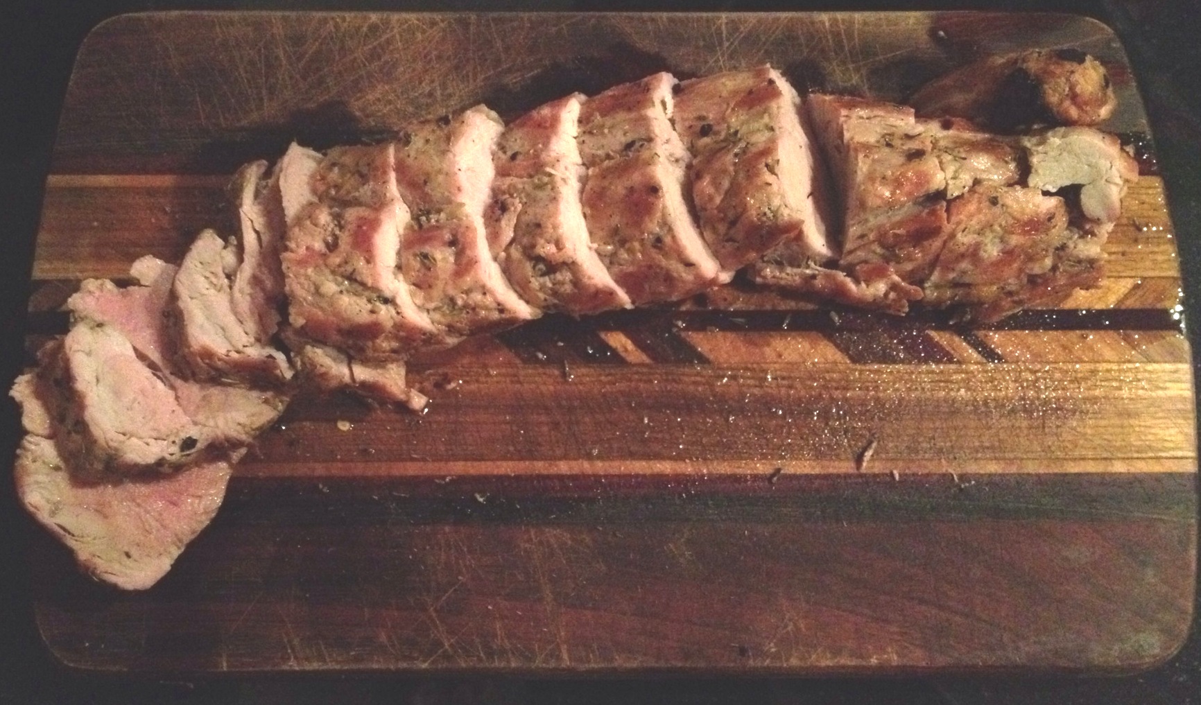 Sometimes cooking simple is the best –particularly on evenings where all you want to do is collapse into your couch. On exactly this type of evening, I grabbed a pork tenderloin at Trader Joe’s, opened my spice cabinet and invented my own special dry rub of “on hand” materials, which consisted of dried thyme, paprika, ground fennel seeds and ground red pepper flakes. I let this creation marinate for about 30 minutes and tossed it on a hot grill (medium high). I like pork just a little tiny bit pink. If that is what you are going for then let it cook on the grill for about 16 or 17 minutes and then sit for an extra 10 to 15 before slicing.