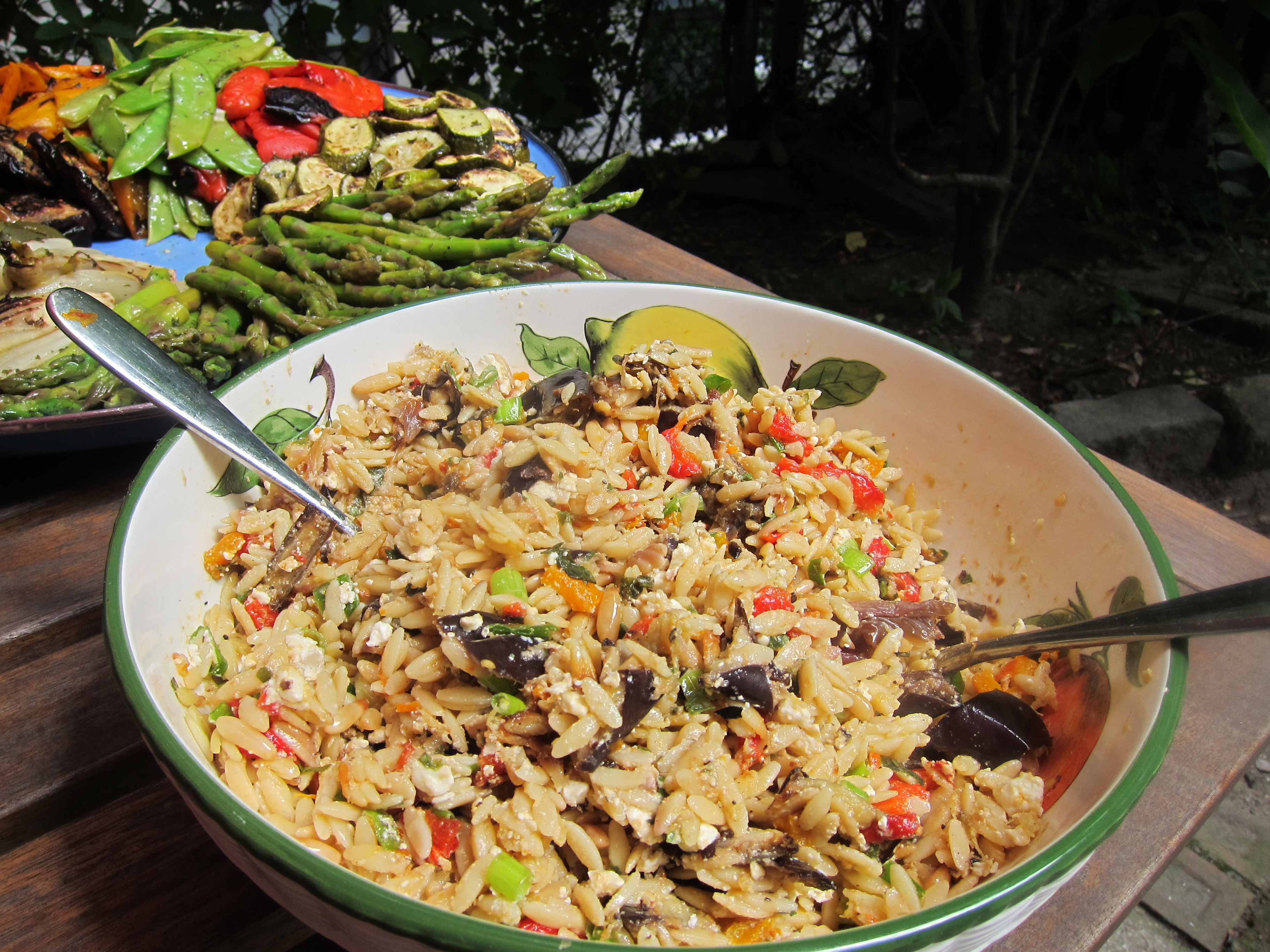So all the props go to Ina Garten for this recipe. But it is so good, it is worth writing about even if I had nothing to do with it’s creation. There is something about the combination of orzo, fresh basil, roasted eggplant, roasted peppers and feta that is so divine and scrumptious! This is one of those salads that you can bring to any summer potluck and people will think you are the best cook ever. If you manage to have any leftovers, you will find that they miraculously disappear in the middle of the night or at least before you are able to eat it. Seriously, people that don’t normally compliment your food will remark about how good this is. And what is wonderful about it is that you can make it the day before, as I did this weekend to take with me to a party in the city.