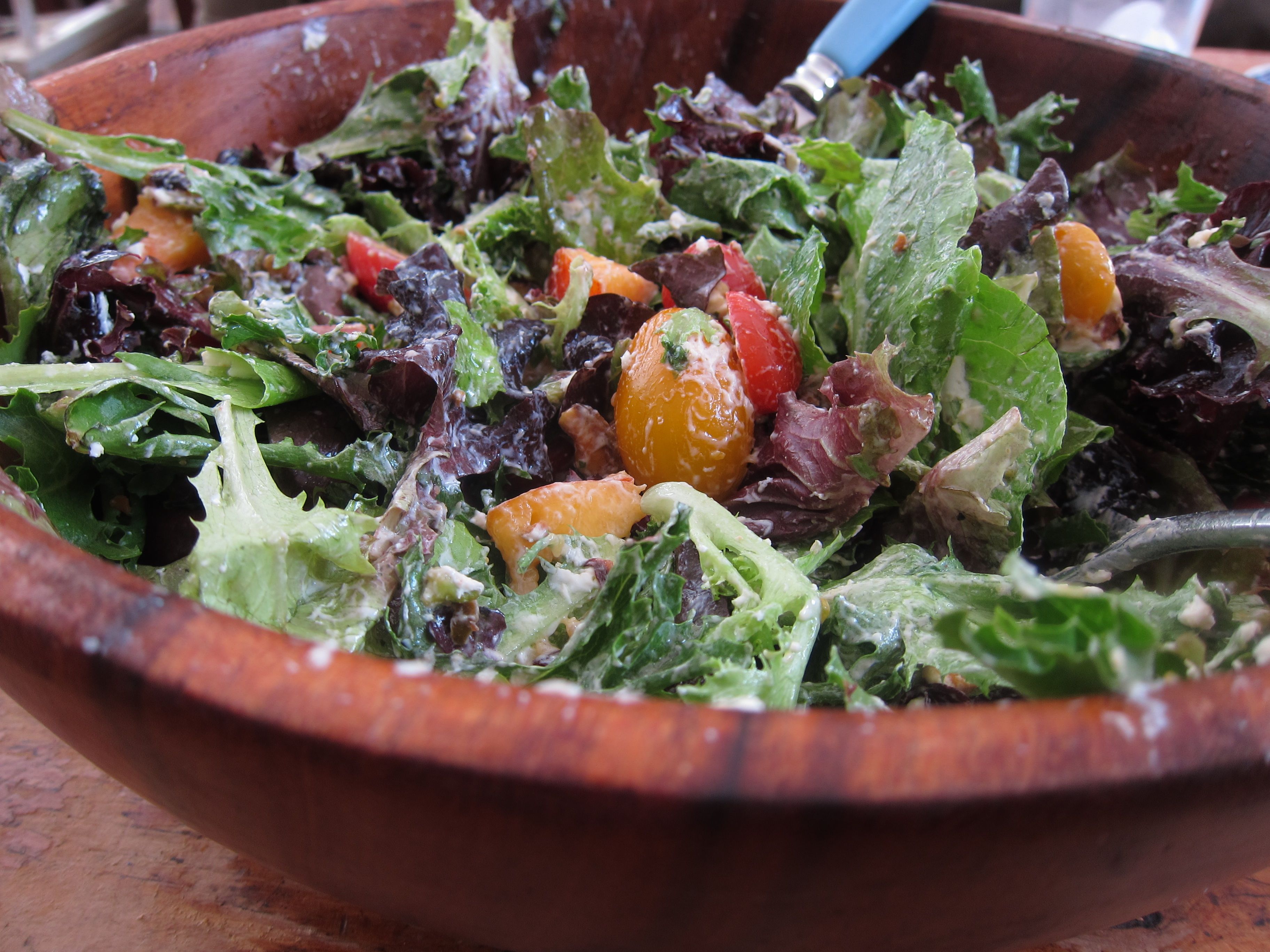 - Combine mixed greens and cherry tomatoes in salad bowl.