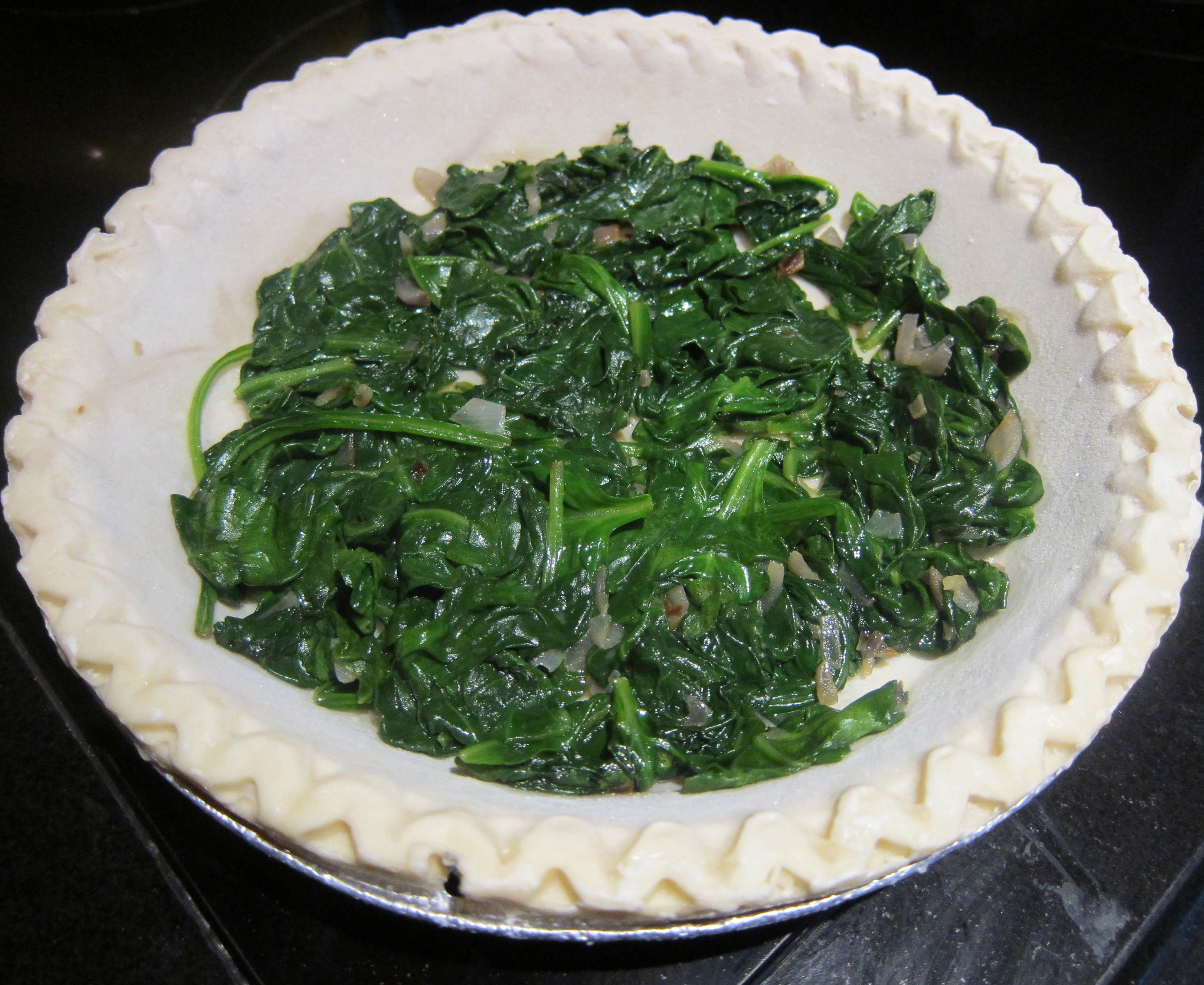 - Pour spinach mixture into the bottom of the pie crust, covering the bottom.