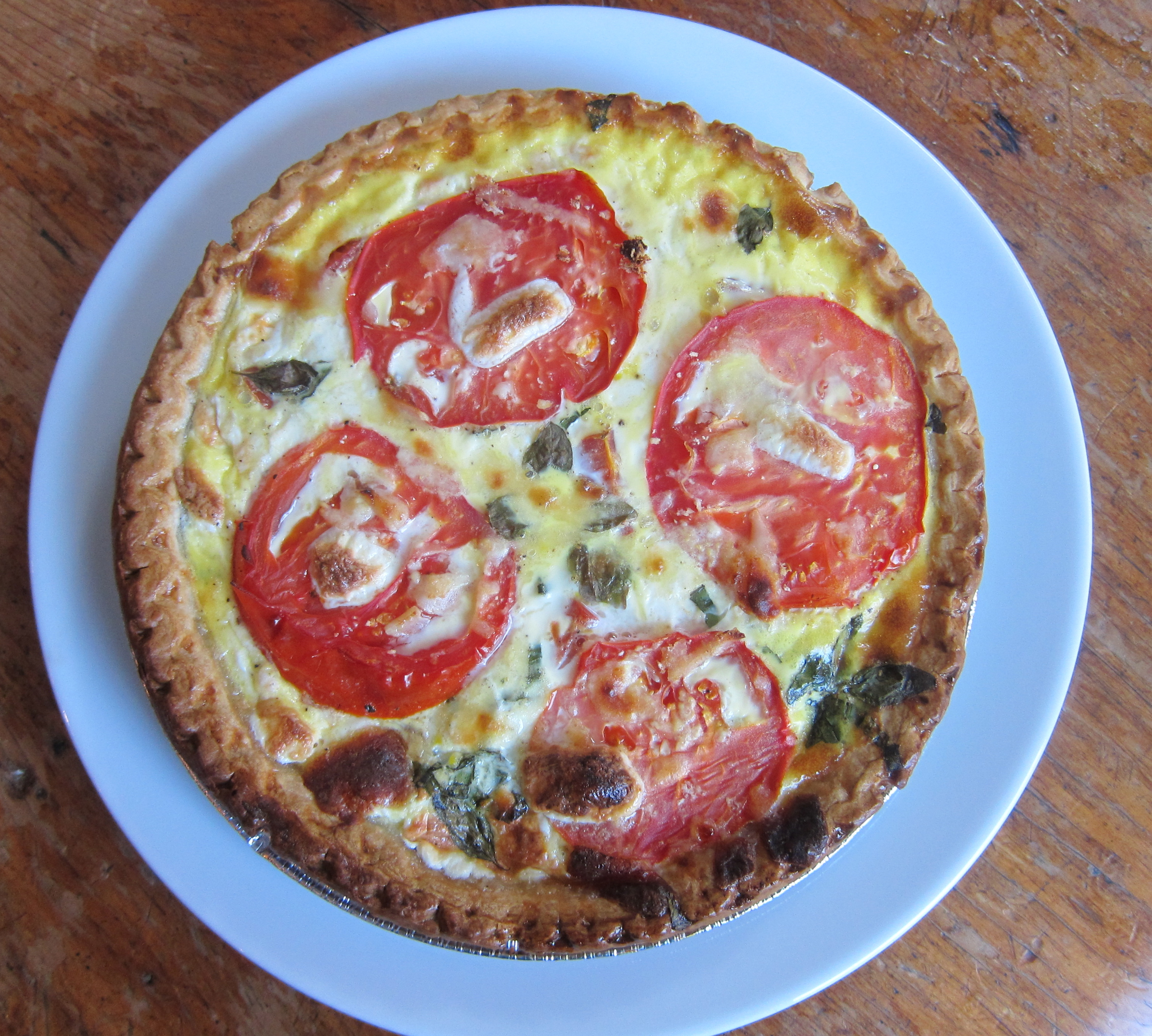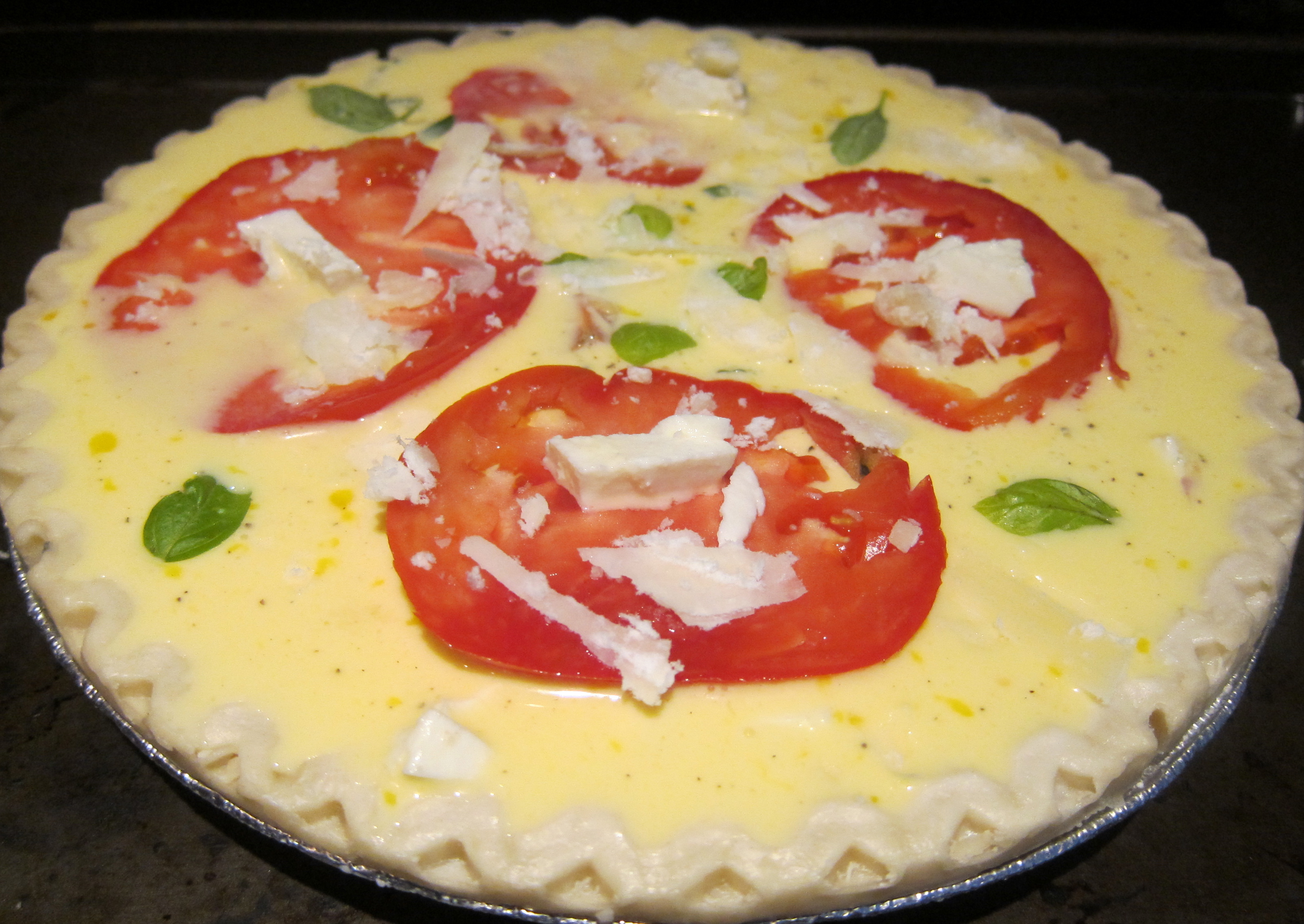 - Top quiche with thinly sliced beefsteak tomatoes, small basil leaves and a sprinkling of fresh mozzarella and shredded Asiago.
