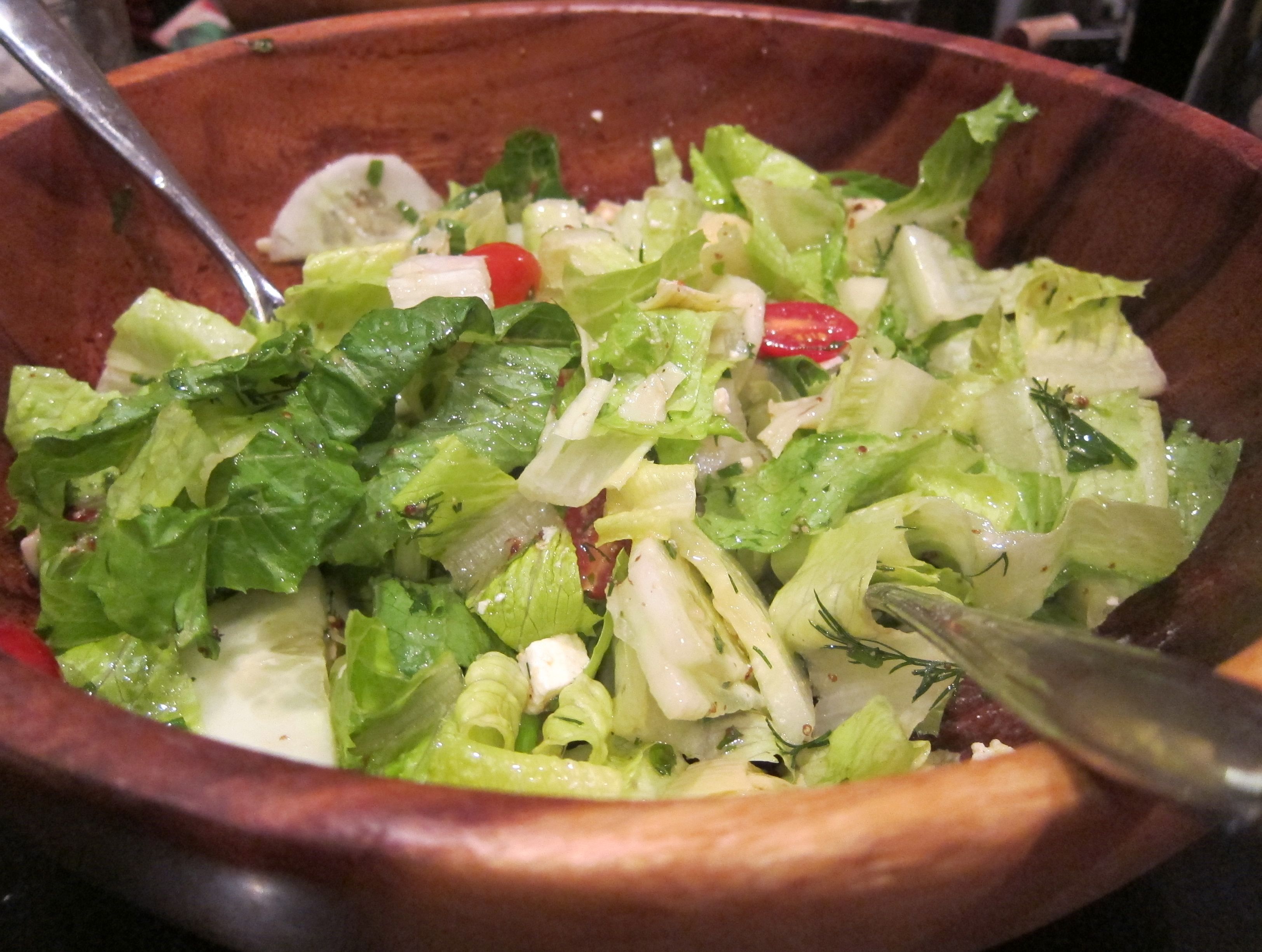 This salad of hearts of romaine, cucumbers, marinated artichokes, grape tomatoes, fresh dill and parsley is an adaptation of a Greek salad. It is light on oil and heavy on the herbs. More importantly, it is an ode to our summer that has bid us adieu. But you must try it before the frost comes! Particularly if you have some extra dill and parsley hanging around 🙂