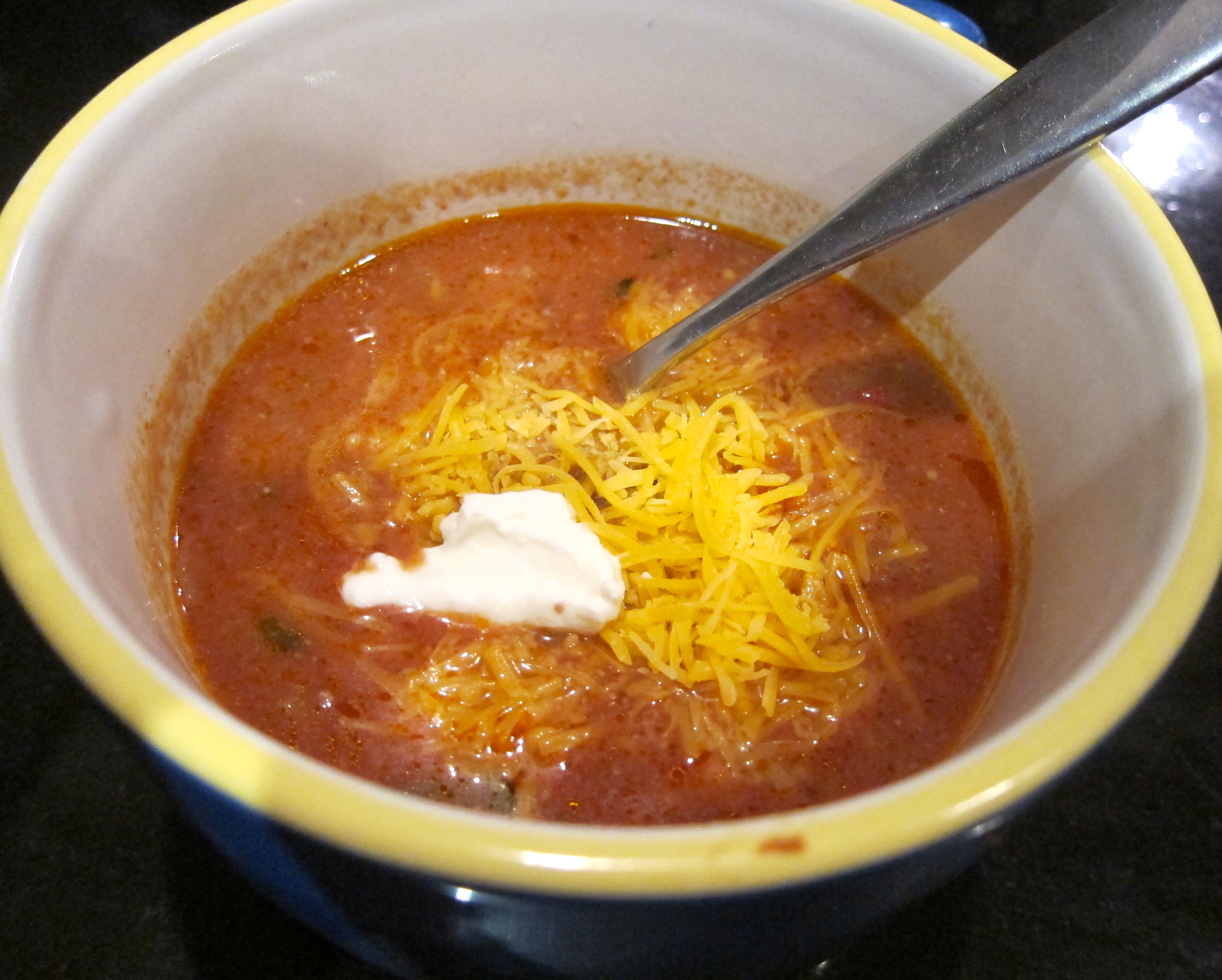 I will give Emeril credit for inspiring this chili, although I did deviate a bit from his recipe. I would cut back on the amount of chicken broth, particularly if you don’t have time to let it simmer off the water for hours (I used 6 cups and would reduce to 4 because it was a bit brothy for my chili tastes). I also selected my own mix of spices based on what I had available on hand in my spice rack. It delivers a little kick, but not too spicy for those with milder taste buds. And while the list of spices may seem intimidating, dumping them into the chili really takes little time for the yummy end result.