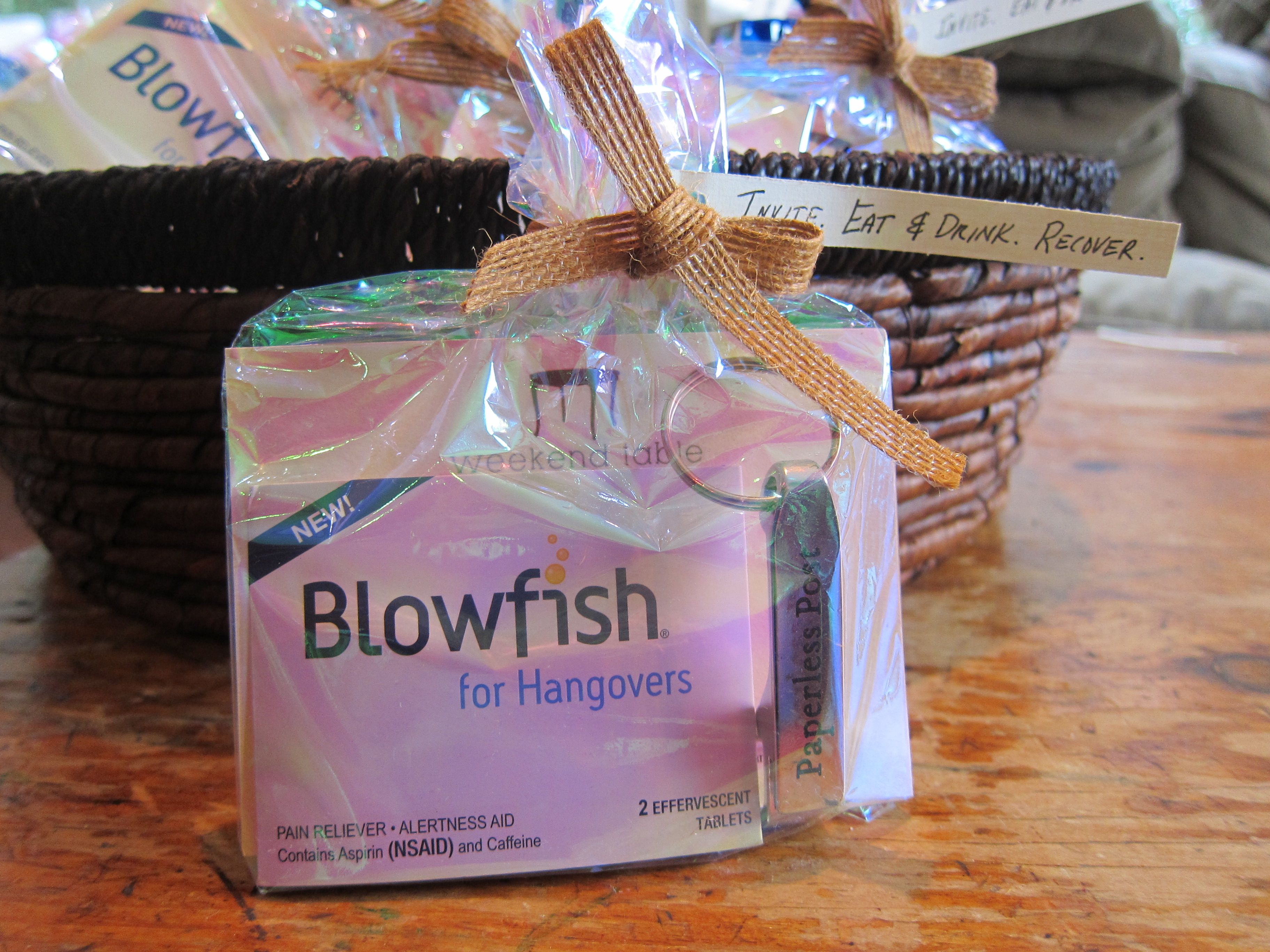 And at the end of a night that included much dancing toward the end, our guests left with a little gift. They were encouraged to Invite through the use of Paperless Post, eat & drink by using recipes from Weekend Table, and recover with the hangover remedy, Blowfish. Let’s hope they take advantage of all three! Cheers!
