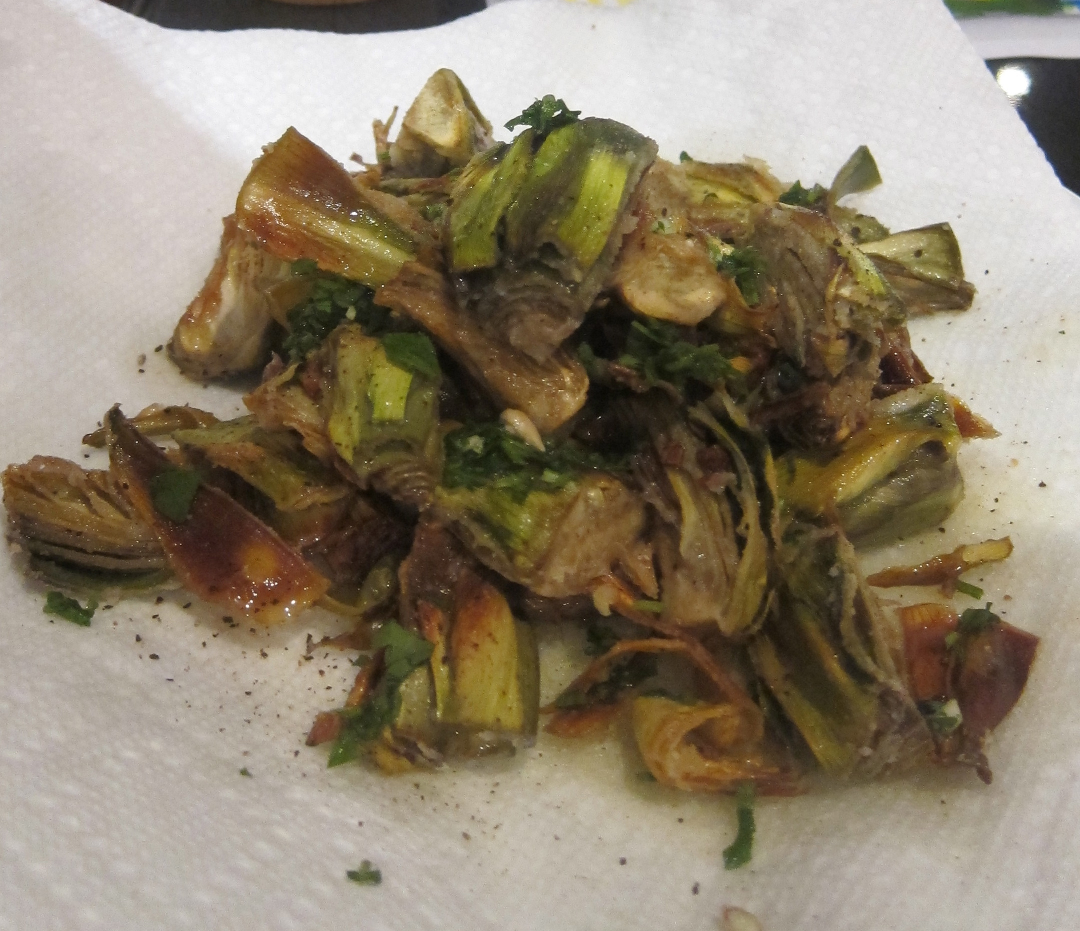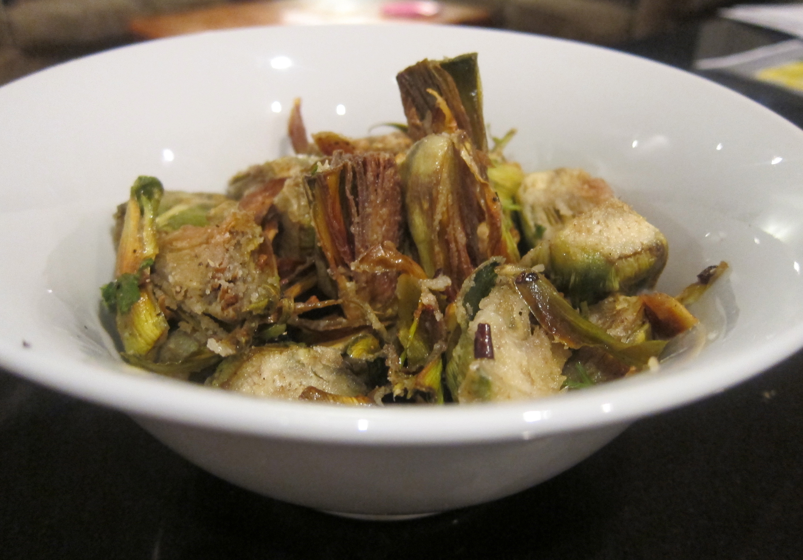 I am one of those people that sees fried baby artichokes on the menu and insists on ordering them. It’s a bit of an addiction. But given the paucity of my dining out experiences as of late due to those individuals known as children, I decided to try them at home for the first time.