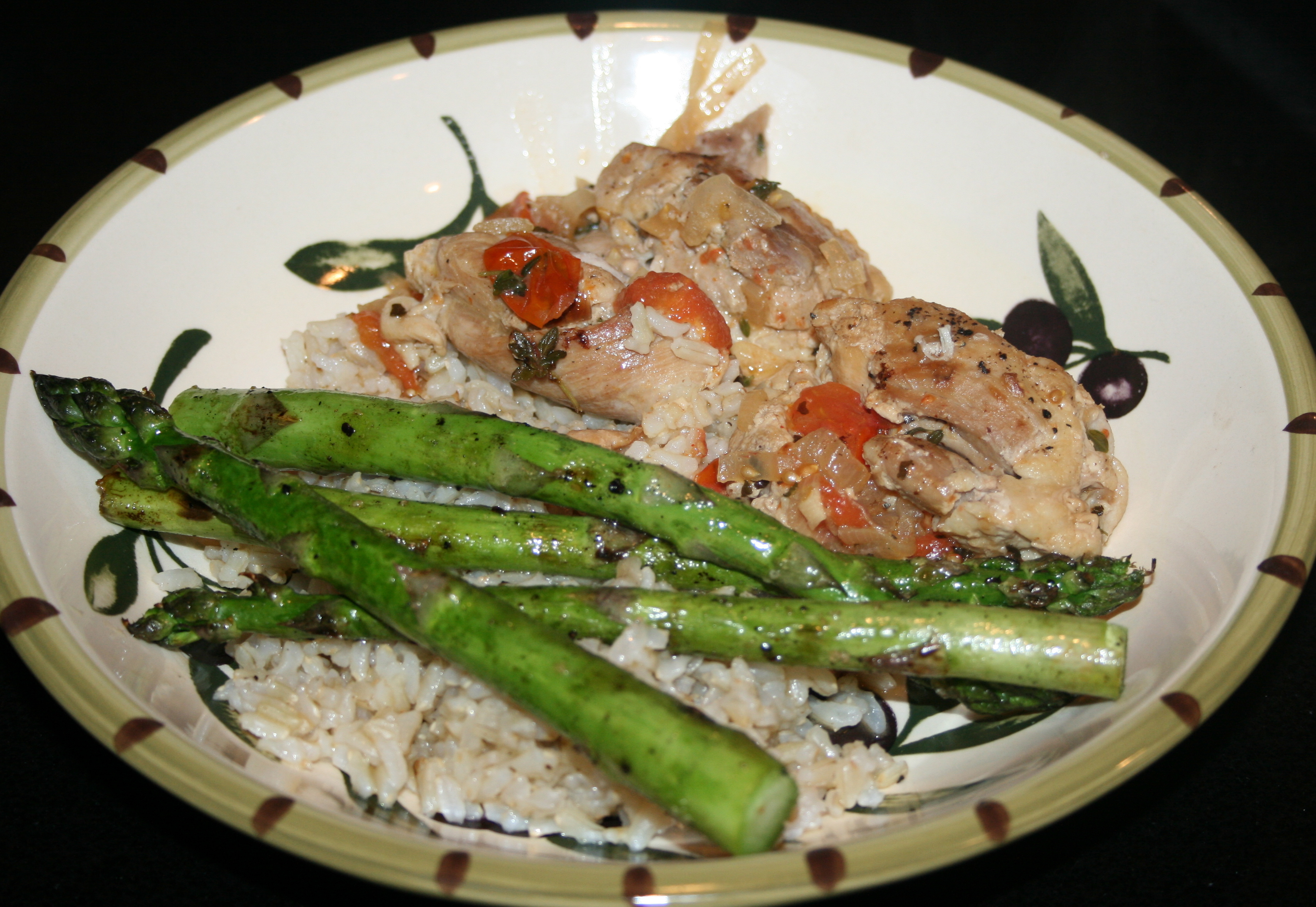 This recipe is relatively simple to make, and with a small amount of energy can be accomplished on random week night or impress guests on the weekend too. Once you’ve got the chicken thighs browned (about 6 minutes), the shallots sauteed (another 4-5) and you toss in the fresh herbs, spices and tomatoes with that chicken, you simply pop it in the oven for 20 minutes at 350 degrees. I recommend serving it with brown rice and grilled asparagus (as pictured) or sauteed spinach or kale.