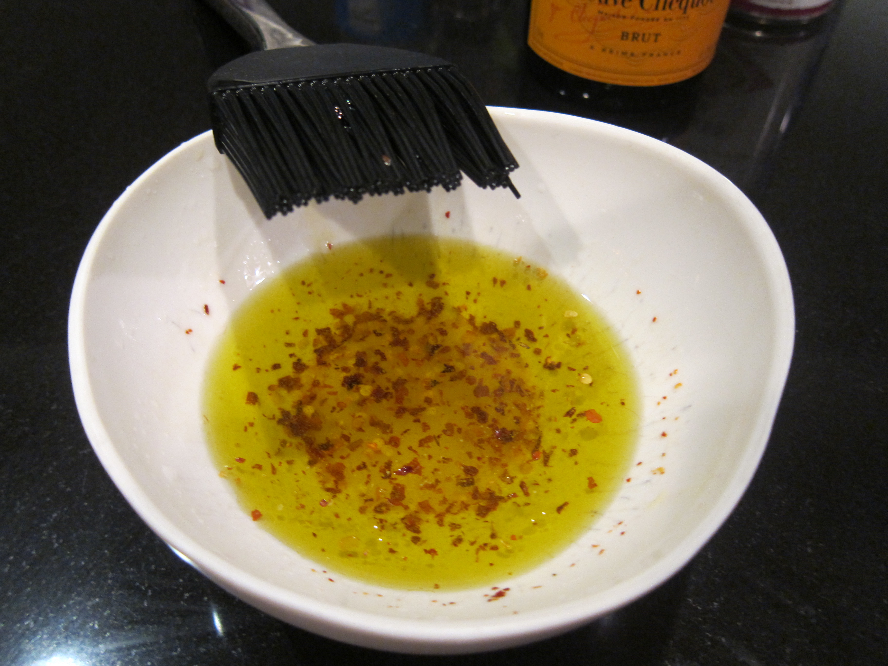 Next, make your marinade. It’s easy. About 1/2 cup of oil, the juice of one half lemon and 1 tsp of red pepper flakes.
