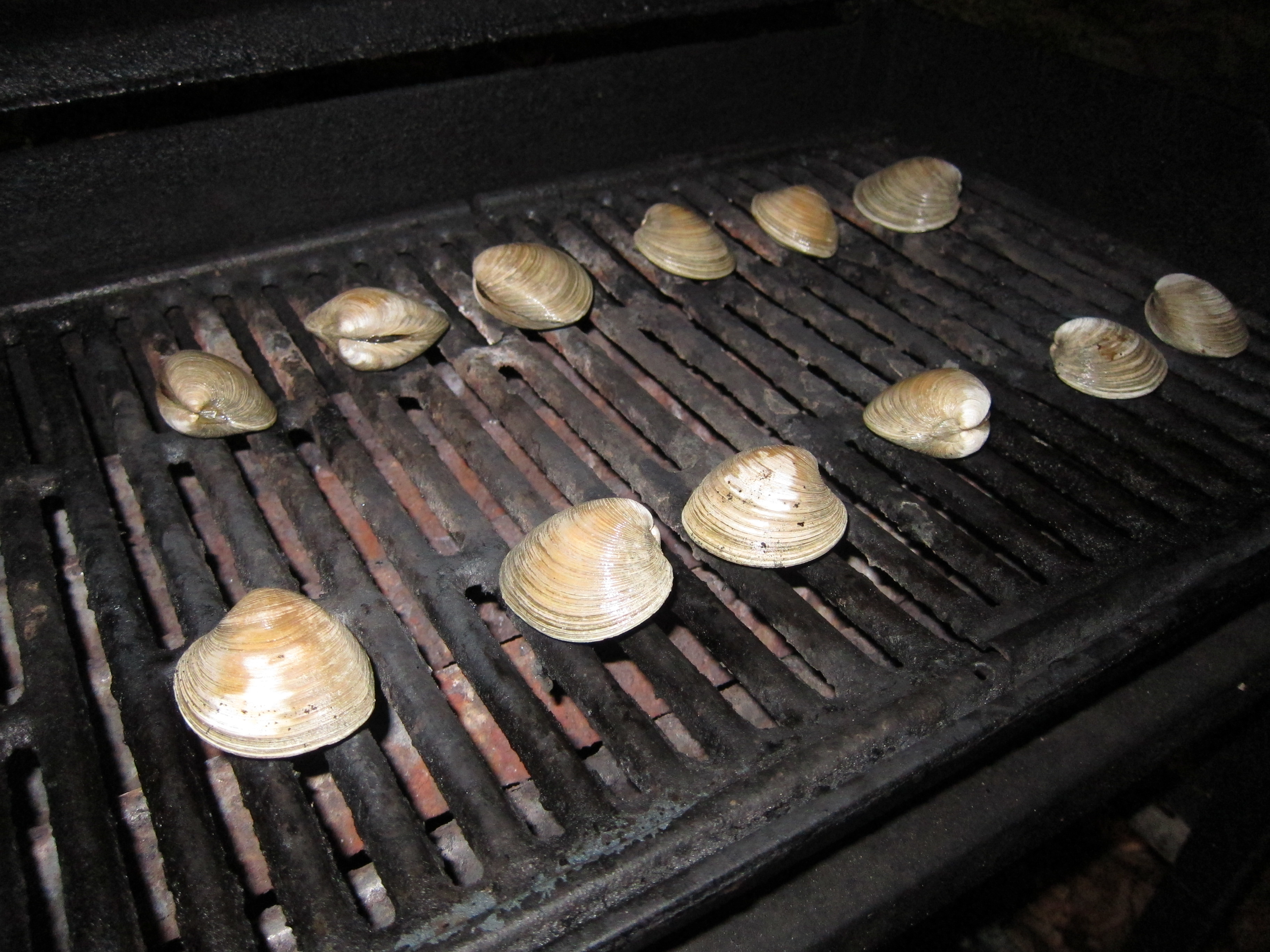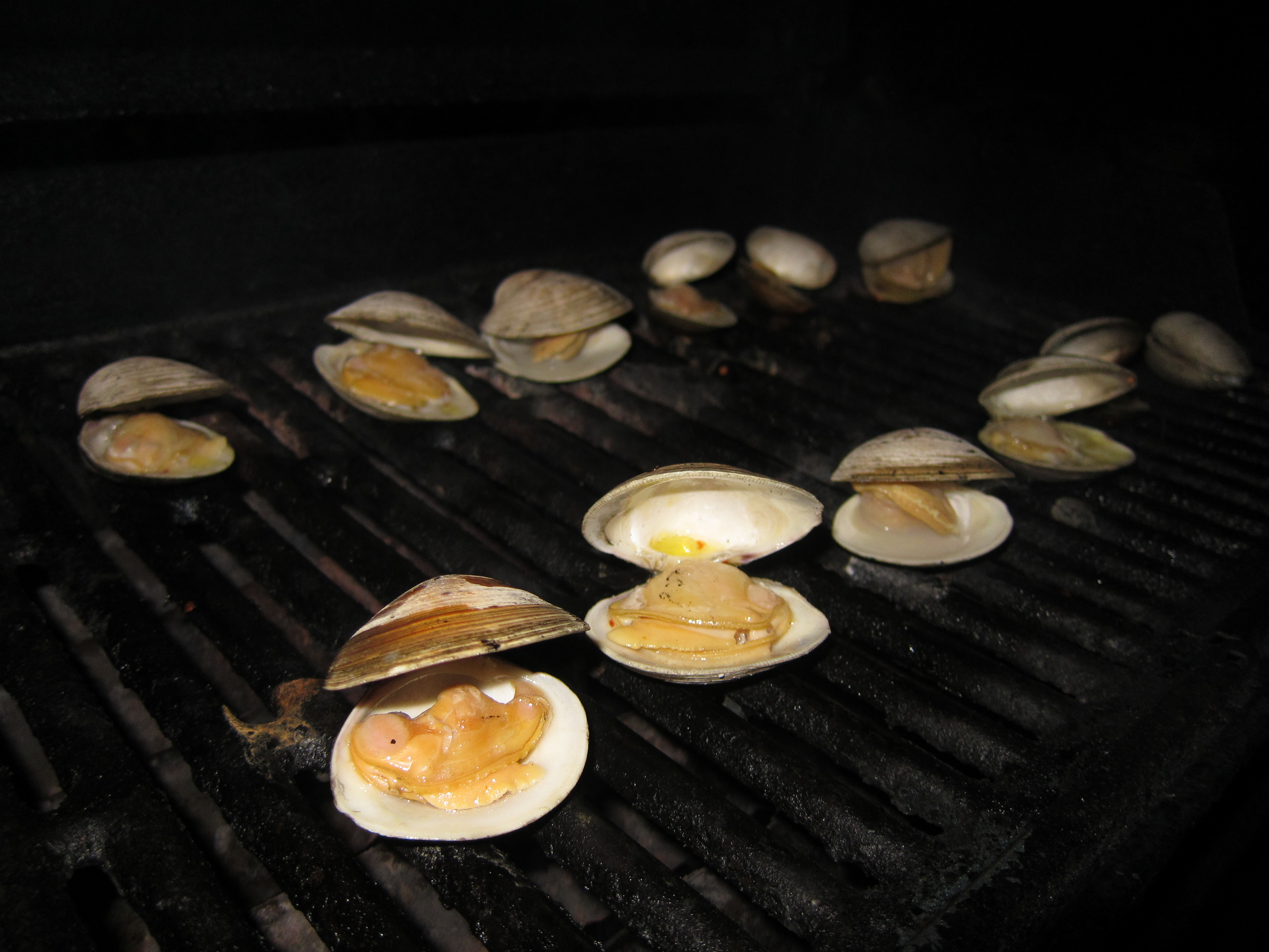 - Place clams on grill flat and grill for 5-6 minutes with grill lid down until clams open. Discard any unopened clams.