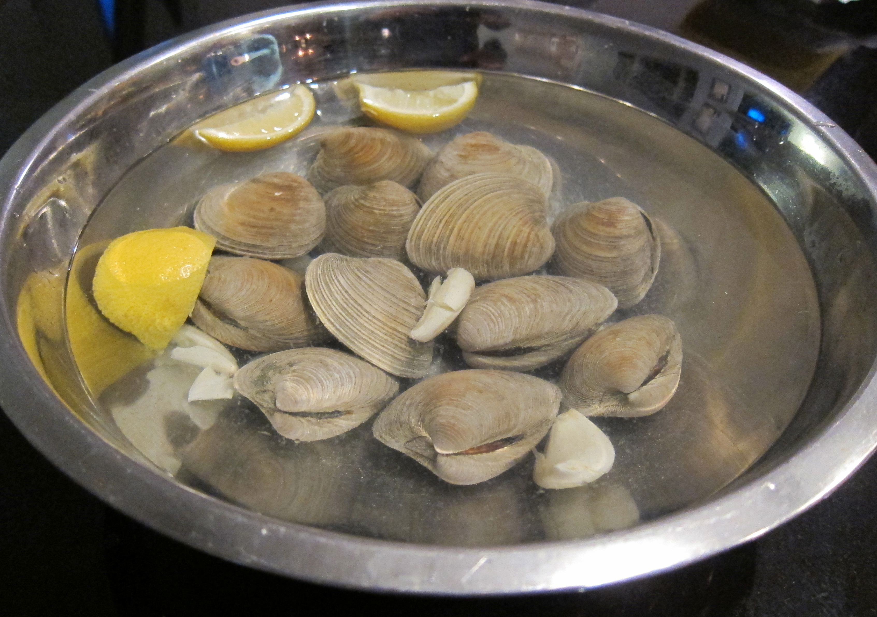 - Squeeze half a lemon into the water and add clams, submerging them. Let sit for 1 hour.
