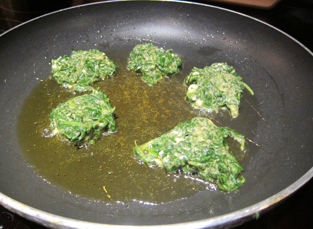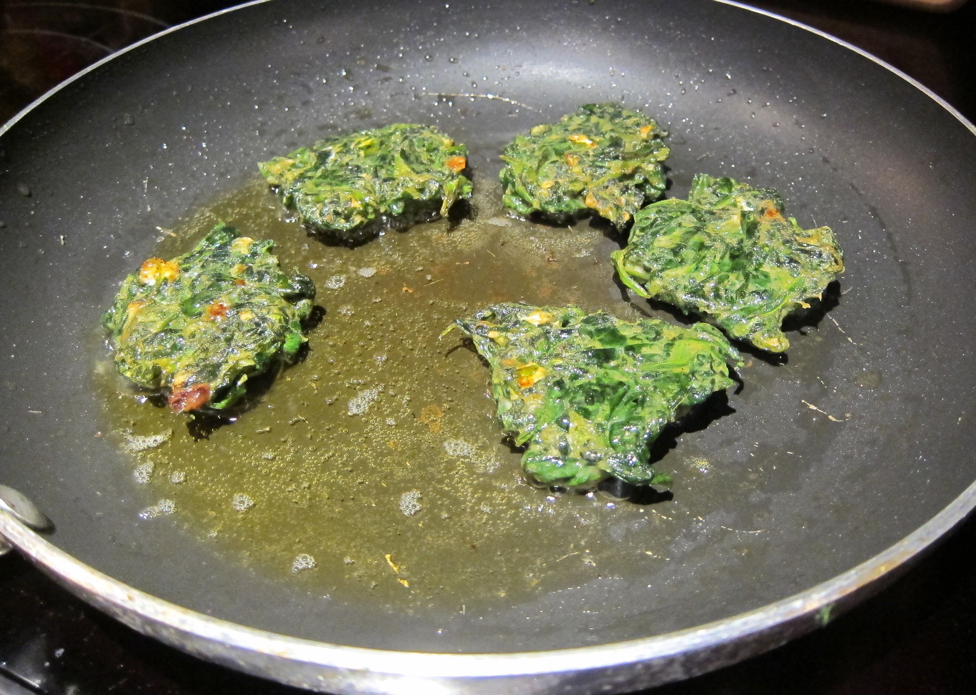 - When sizzling, add five 1 tbsp dallops of spinach mixture, flattening each of the dallops with the bottom of a spoon. Let cook for 2-3 minutes then flip and cook for 1-2 minutes more.