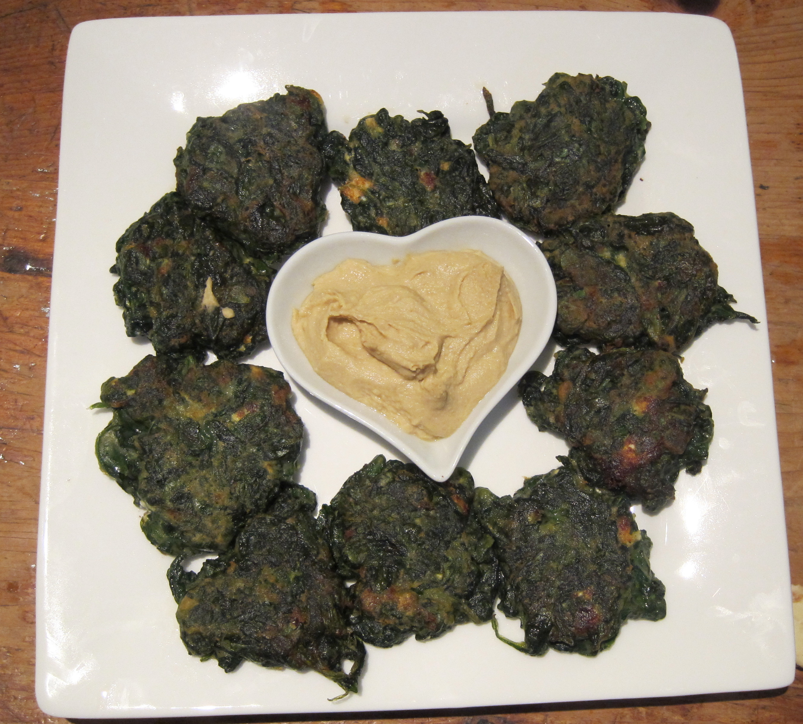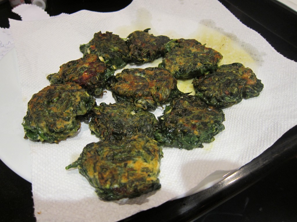 So here’s how it went. I sauteed a bunch of spinach in a little olive oil, drained it and chopped it up a bit and put it in a big bowl. I added a whisked egg, some flour, cumin, cayenne, paprika, garlic powder (too lazy to chop the garlic), goat cheese, salt and pepper into the bowl. I mixed it up real good.