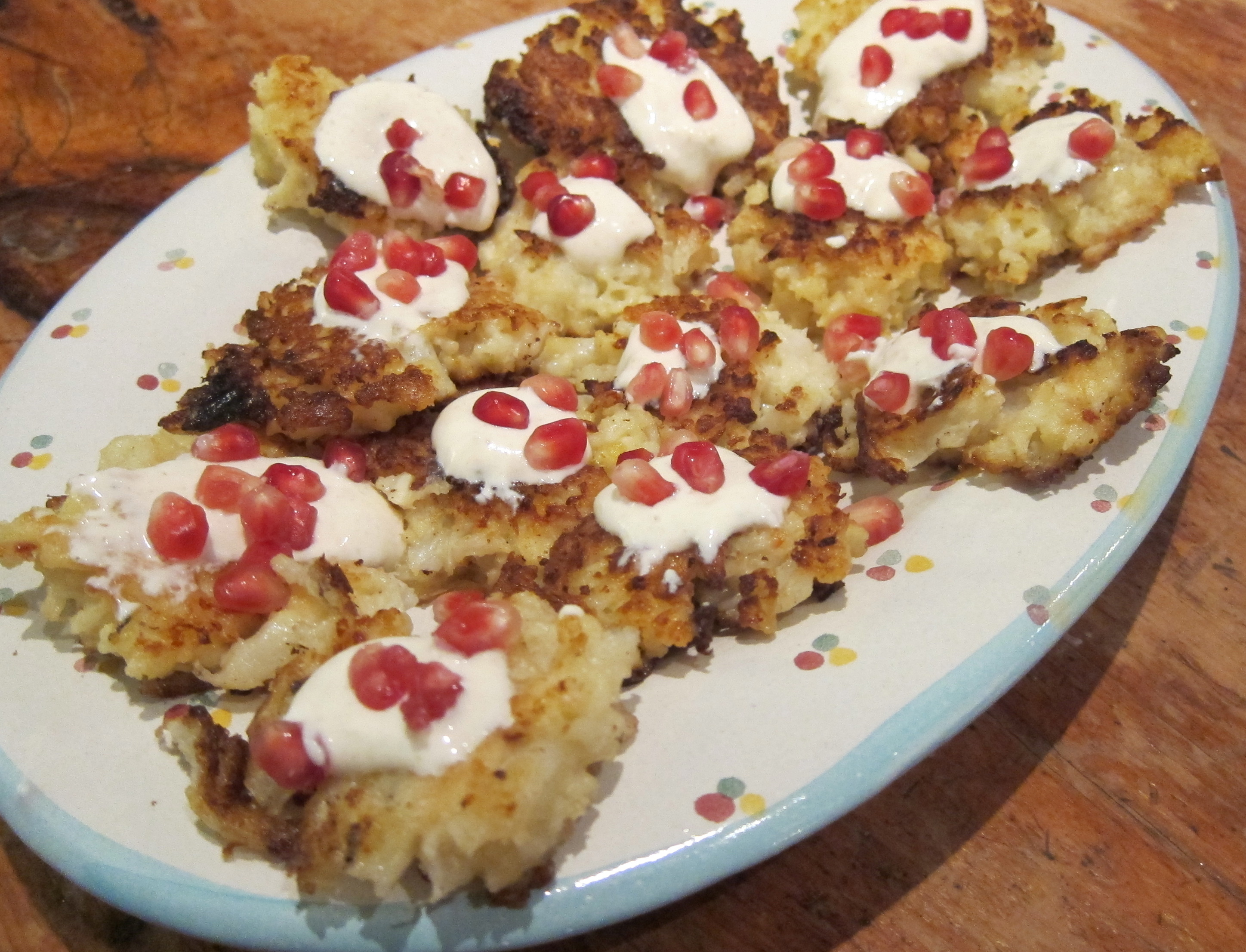 - Once all fritters are cooked, mix yogurt with cumin, salt and pepper. Spread fritters on serving platter. Dollop each with cumin yogurt and sprinkle with pomegranate arils.