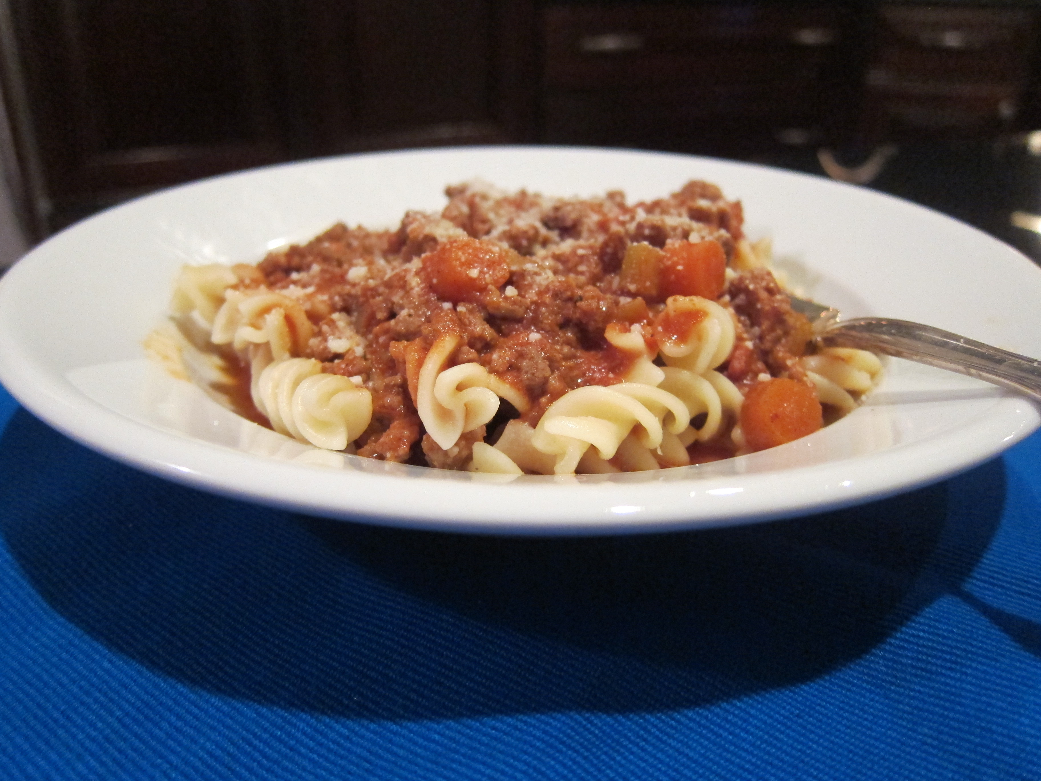 So yesterday into the slow cooker went frustration over careers plateaued by unfair politics, recessions and the decision to have children, along with some carrots, celery, garlic and a shallot. In went guilt over not spending enough time with my children together with some ground meat, ground pork and a lonely piece of turkey bacon (I’d have added more if I had it!). In went tears over missed opportunities due to my own inaction, a little mediocre wine given to us by some vendor at christmas and some tomato paste. In went a little generalized anger along with some crushed red pepper, black pepper and salt. In went anxiety over money and the future along with some dried basil, a touch of nutmeg, a big can of crushed tomatoes and some chicken stock. I stirred up all that food and emotion and walked away from the crock pot. I let it all just simmer away.