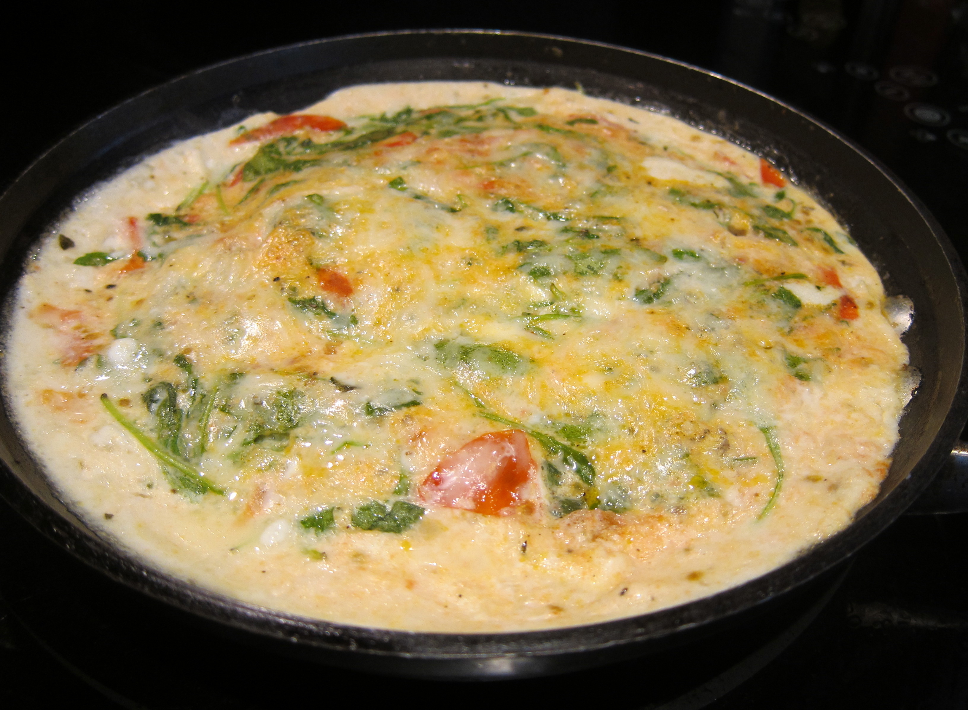- Add egg mixture, stirring the tomato/arugula mixture so it is evenly distributed. Let sit in pan for 4 minutes until eggs begin to set.