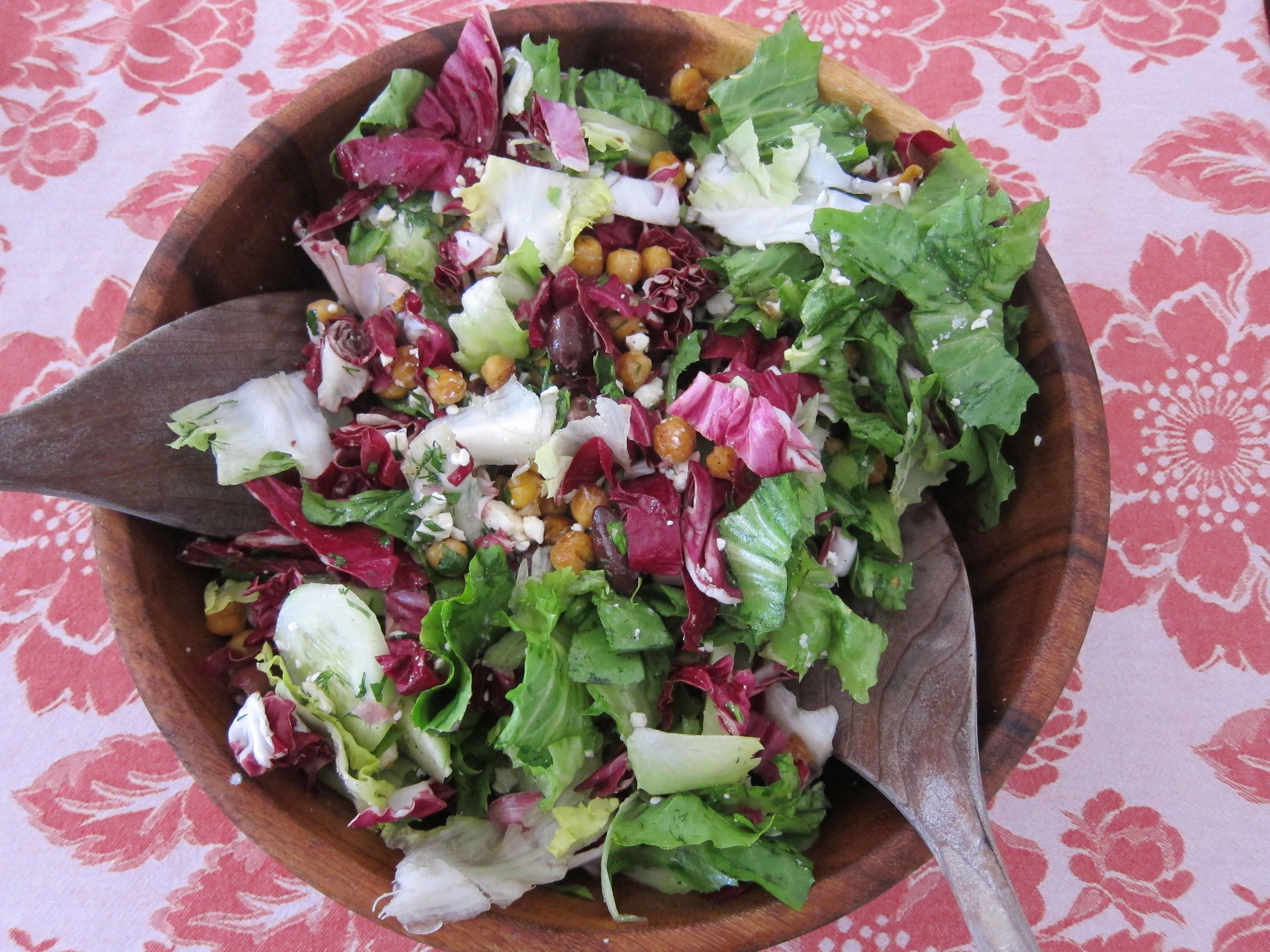 This “Daddy’s Salad” is a labor of love. It is comprised of all those ingredients that my balding hunk of a husband adores: Escarole, radicchio, cucumber, feta cheese, kalamata olives and the ultimate ingredient, pan-fried chickpeas with a sprinkling of salt, pepper, paprika and cumin. This combination is all dressed up in an herb vinaigrette containing dill, parsley, salt, pepper, shallots, olive oil, sherry vinegar and touch of honey.