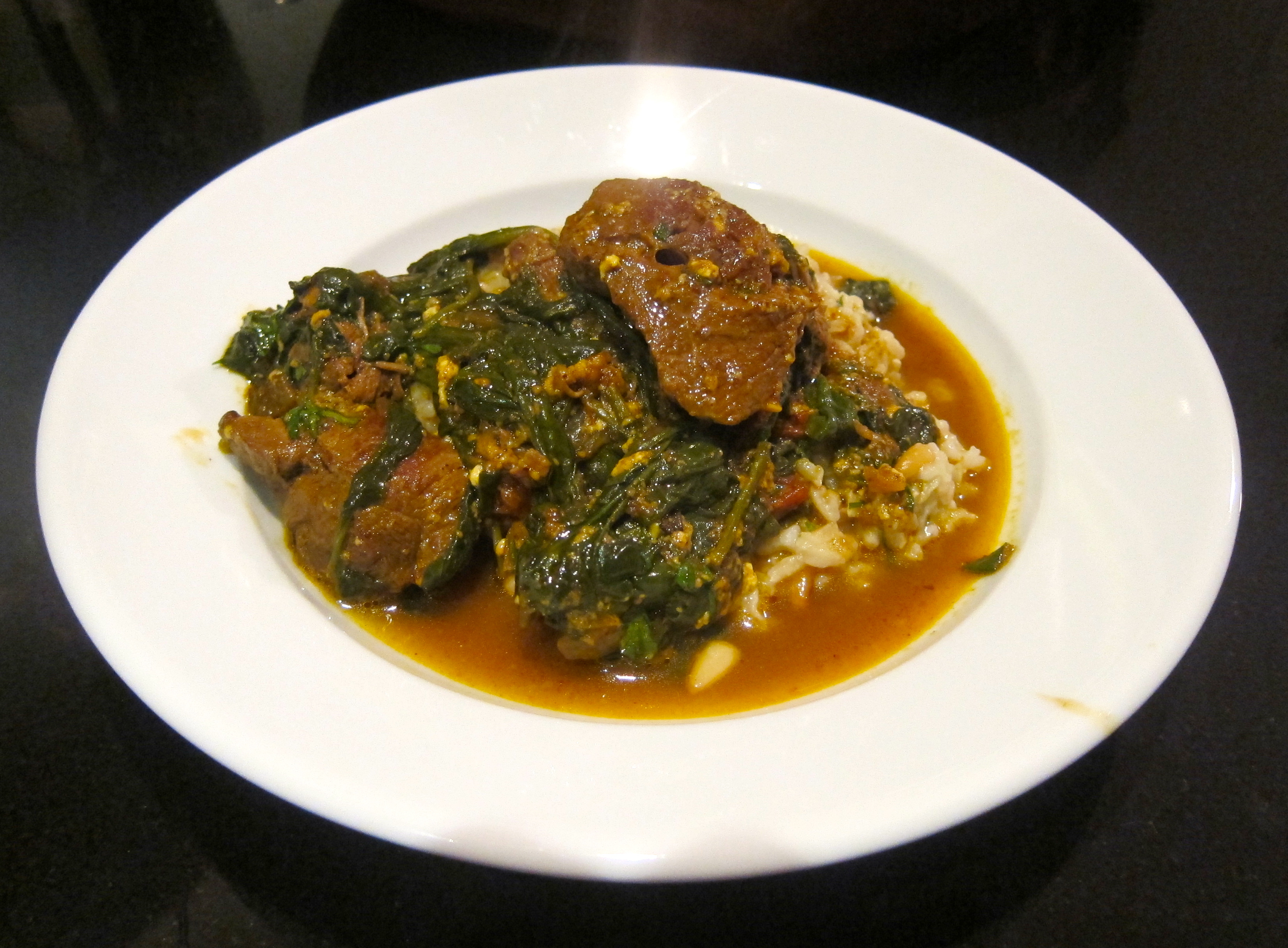 I liked that I went lighter on the spices, the oil and the onions and garlic, more so than a lot of the recipes I previewed. I also only made enough for about 4-5 portions because there was only 1.5 lbs of lamb left in the supermarket and I was experimenting. I added the spinach toward the end along with the garam masala (as many recipes recommended, although there were some that had it in the pot from the start). The addition of the greek yogurt was necessary and gave it a slightly milky element. It was a flavorful dish, but not overpowering or too heavy. It did turn out a little stew like, which was fine with me. You could eat it like a stew or serve it over brown jasmine rice mixed with a touch of butter, salt, pepper and cilantro. Leave out the toasted pine nuts, however. We tried that, and it detracted from the overall taste of the dish. If you don’t have a slow cooker, you can alternatively simmer this stove top on low heat for about 1 1/2 – 2 hours.