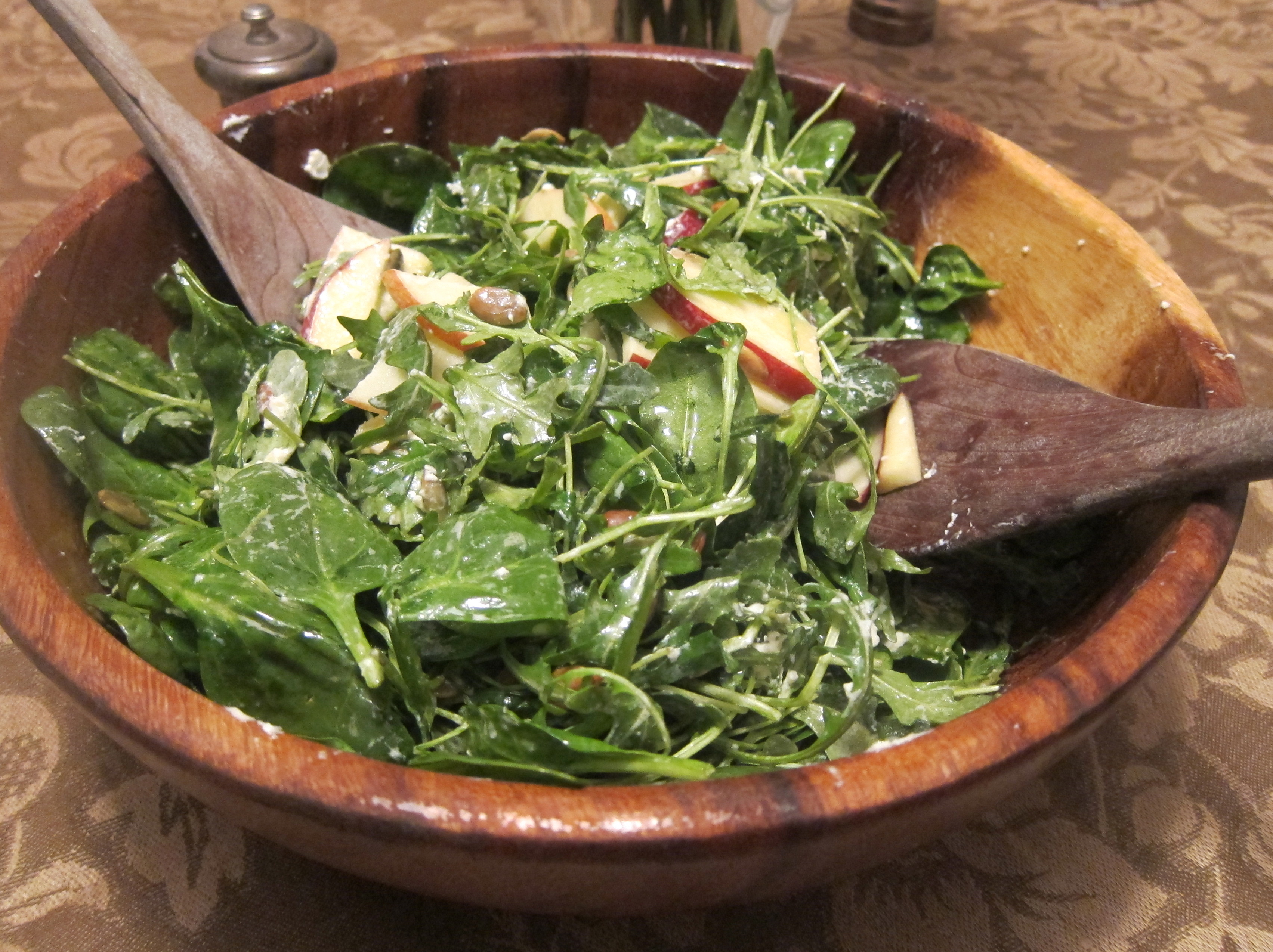 You would be wise to follow my lead and take this arugula and spinach salad with apples, goat cheese and pepitas to the next dinner party you are invited to join. It’s fabulous.