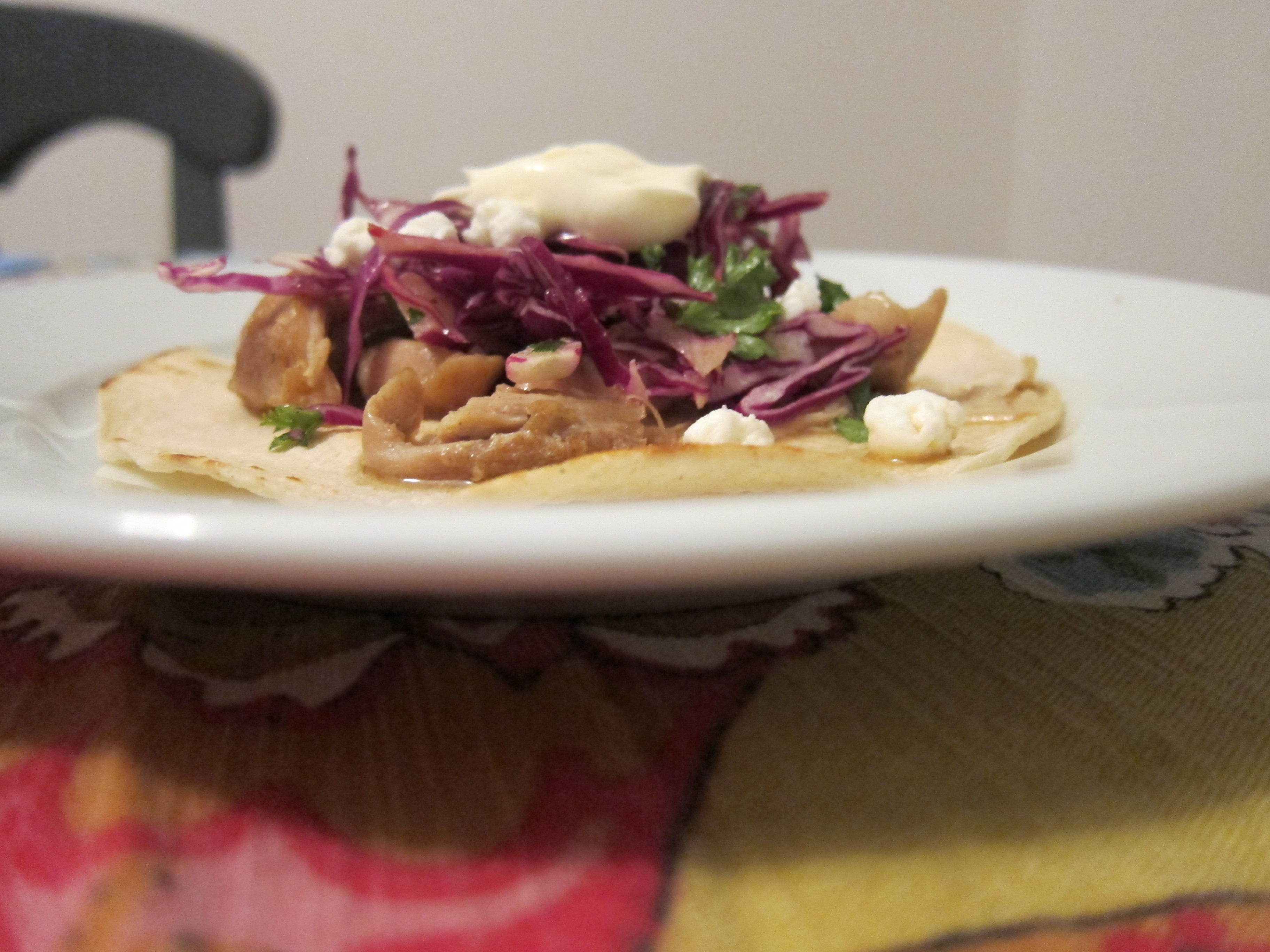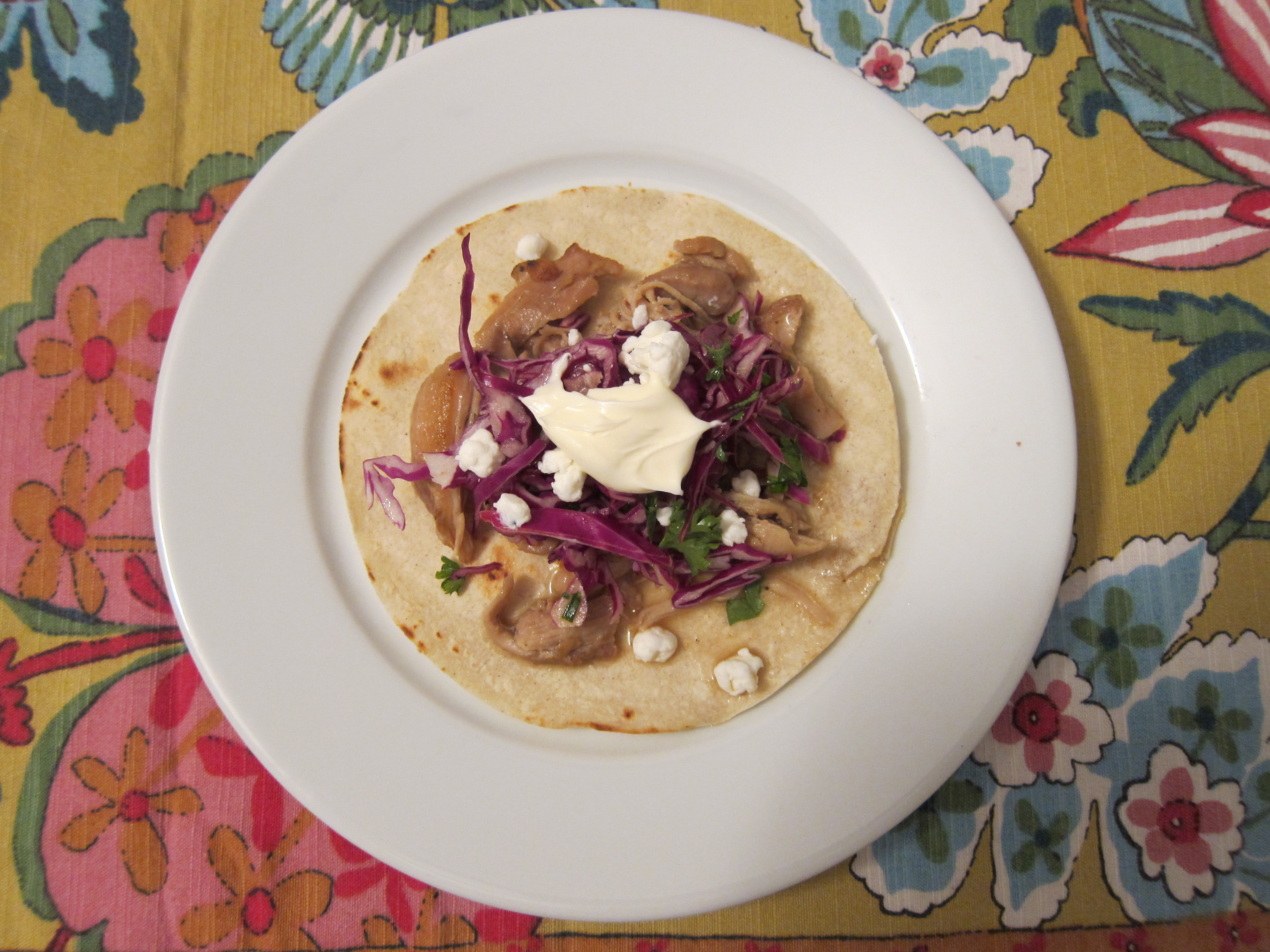 - Scoop chicken into tortillas. Top with slaw and creme fraiche and goat cheese