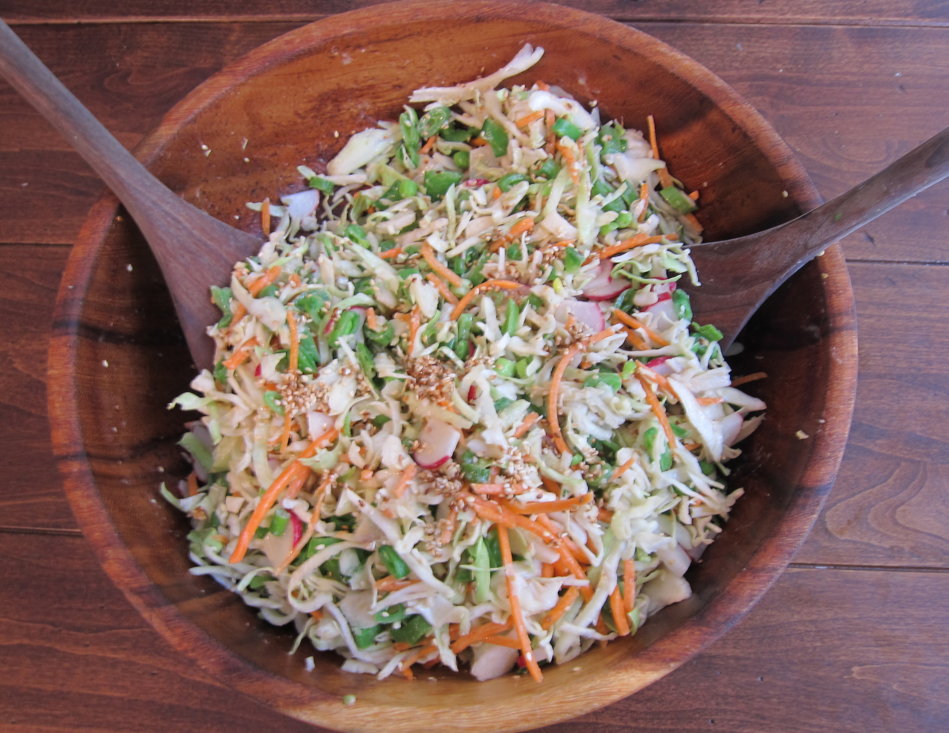 - Toss the peas in a large bowl with the cabbage, radishes, green onions, and 1 tbsp of the sesame seeds. Add carrots and cilantro if desired.