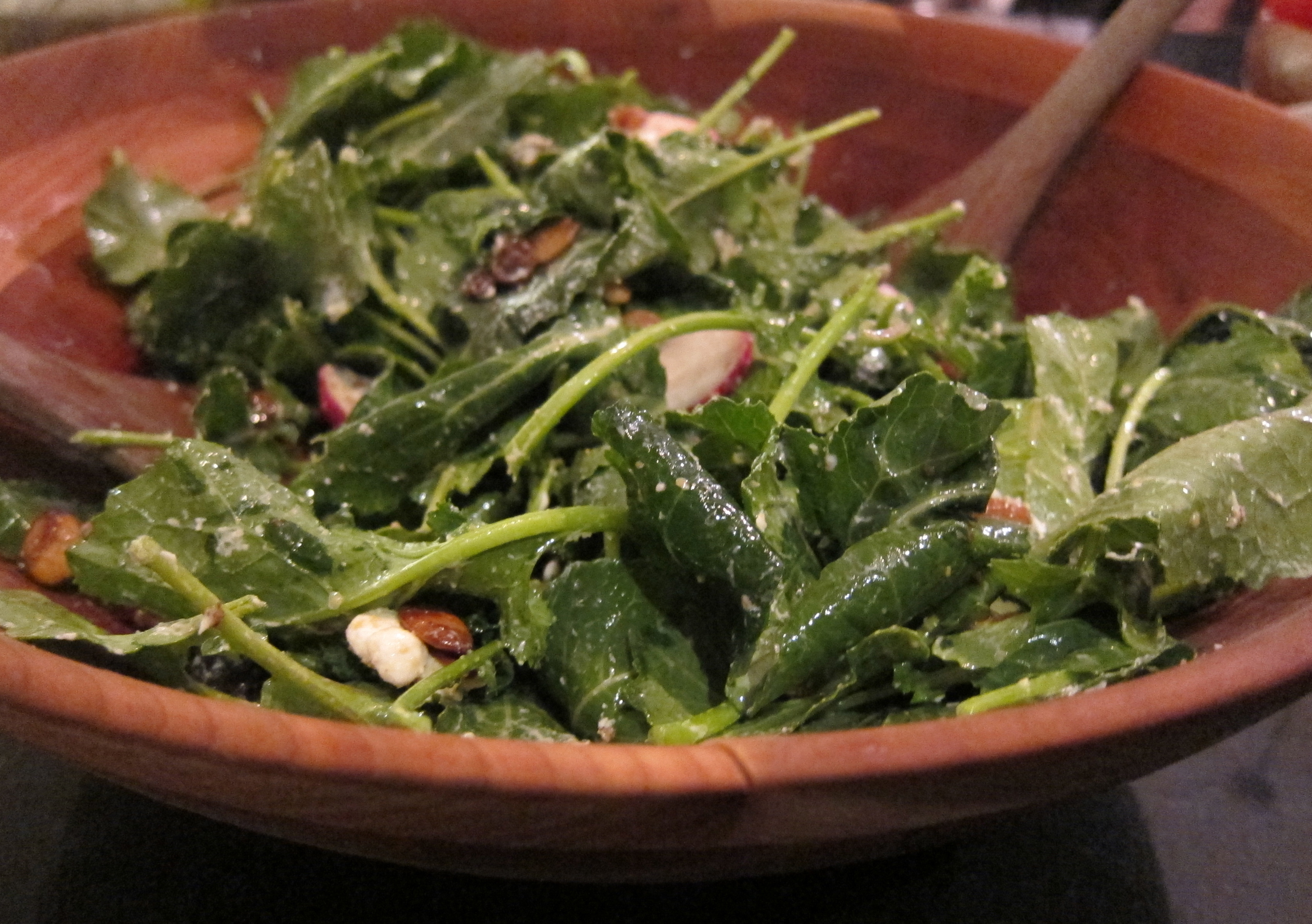 The secret ingredient here is the raisins, which adds a little sweetness to the salad. The not so secret ingredient that makes the salad oh so pretty is the thinly sliced radishes, my favorite vegetable this month. The light dressing of brown mustard, sherry vinegar, honey, olive oil and salt and pepper brings the flavors of the kale, radishes, goat cheese, pepitas and raisins together nicely.