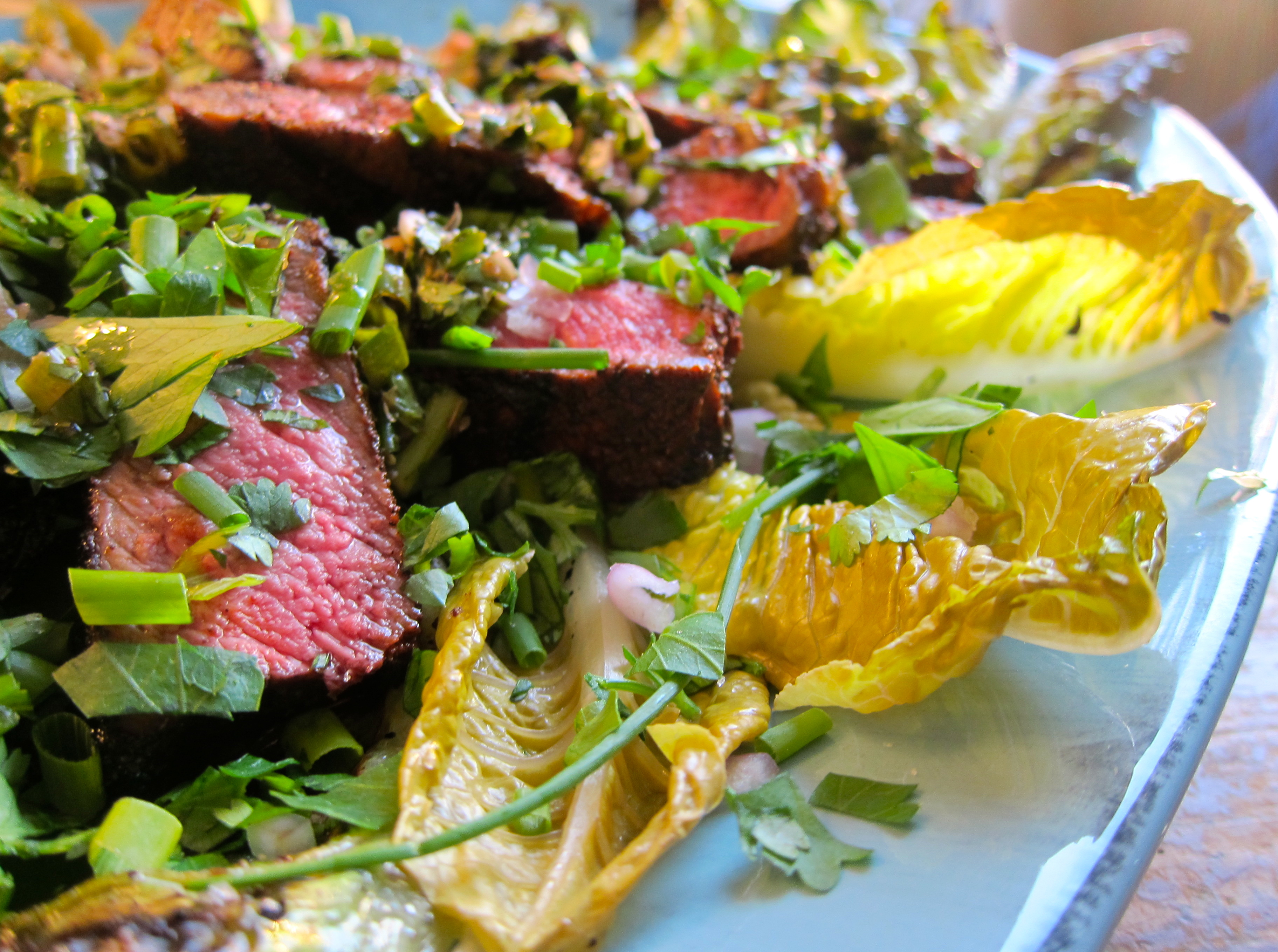 We grilled the steak to somewhere between medium and medium rare and placed it atop grilled romaine and half of the herb salad. It was then dusted with the remaining herb salad and the chimichurri.