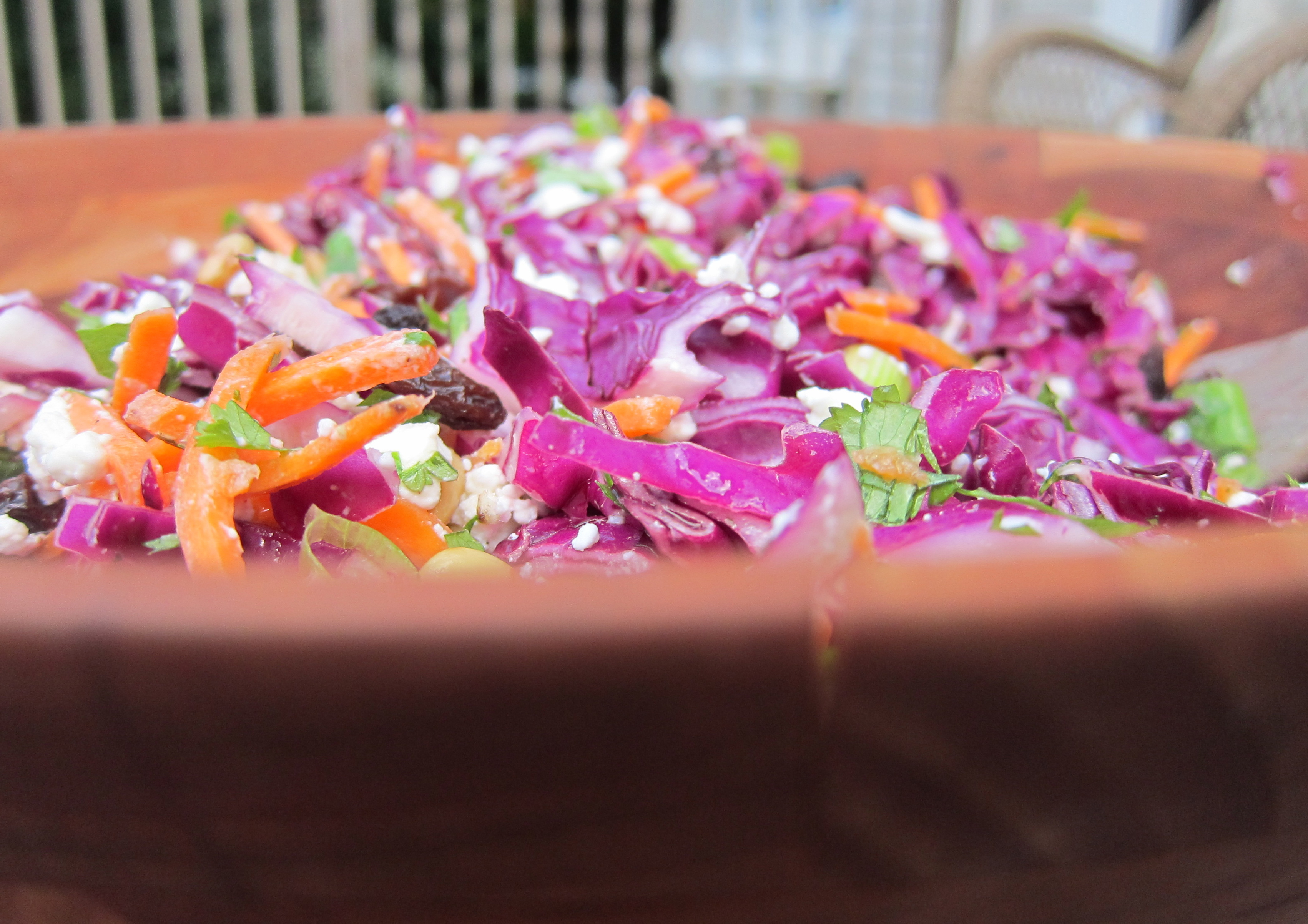 You usually think of using red cabbage in a slaw, but this combination is really a salad. Complete with shredded carrots, raisins, goat cheese, toasted pine nuts and an abundance of cilantro and green onions, this salad is refreshing, yet hearty and satisfying. You can even eat it as a main lunch course.