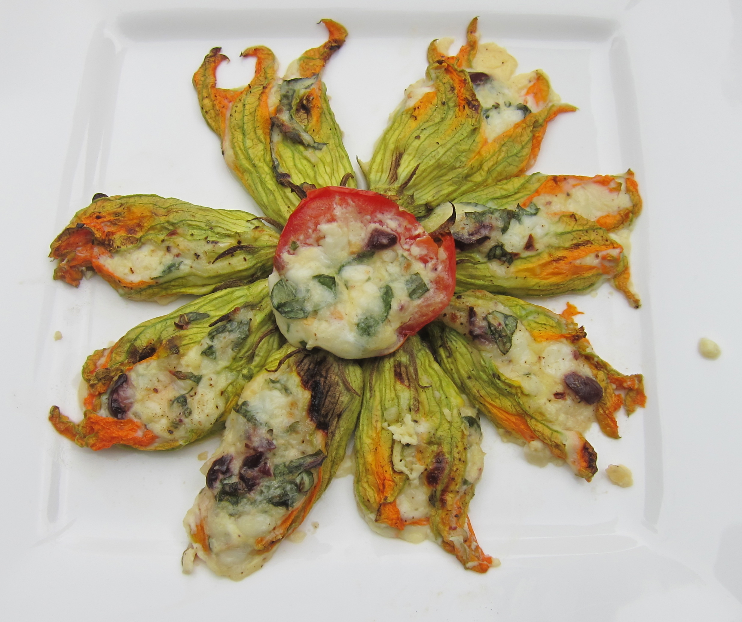 So these zucchini blossom things have fascinated me for quite some time. I decided to buy them without any recipe in mind because of my extreme desire to try to cook them DESPITE having no idea HOW to cook them. After perusing an abundance of zucchini blossom recipes on line, I stuffed them with various random ingredients from my refrigerator, baking (not frying) them to perfection.