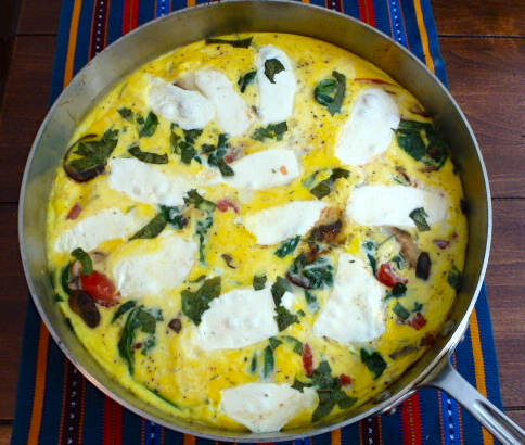 I made this recently for a brunch with friends along with several different summer salads. It was a hit. Much lighter than a quiche, this frittata channels summer into your breakfast adventure. And it’s easy to make. Simply sauté some wild mushrooms in a large saute pan on medium heat until they give off their water. Then add a little baby spinach and some chopped tomatoes and saute for a couple of minutes more. Meanwhile, combine 8 farm fresh eggs with 2 tbsp milk and whisk until blended. Reduce heat to medium low and pour the eggs over the mushrooms, spinach and tomatoes and evenly distribute the vegetables at the bottom. Let sit for a few minutes and then top with sliced fresh mozzarella and basil. Pop it in the oven at 350 for 8-10 minutes.