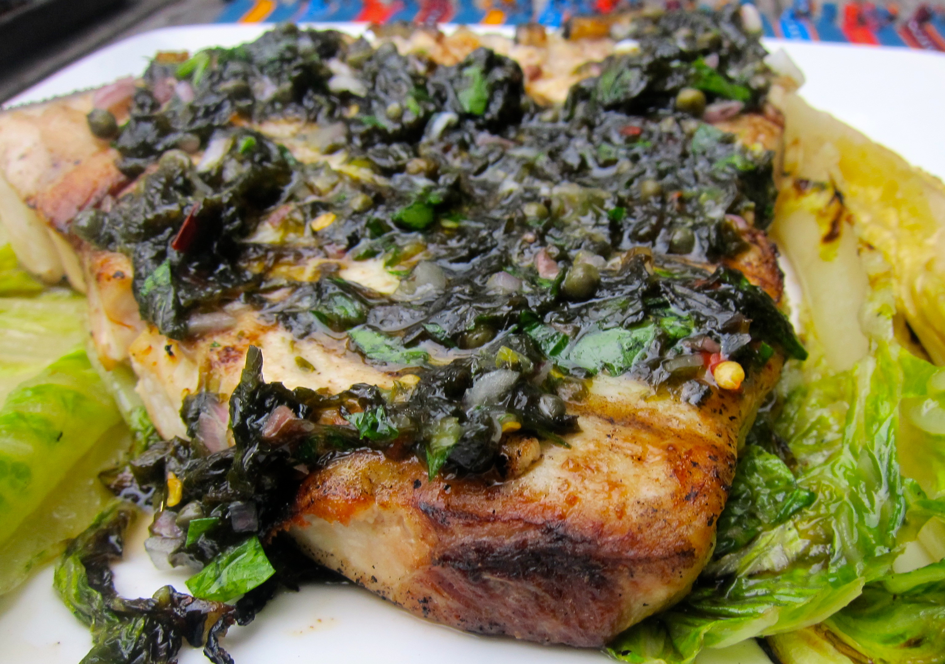 I served this swordfish over grilled romaine along with some grilled asparagus and a tomato and mozzarella salad. We — our family of four — ate it (recipe halved) outside on a hot summer sunday night a couple of weeks ago, but I would most certainly serve it front and center for a dinner party filled with adults. If I were making it tonight, I’d add some fresh corn to the mix.
