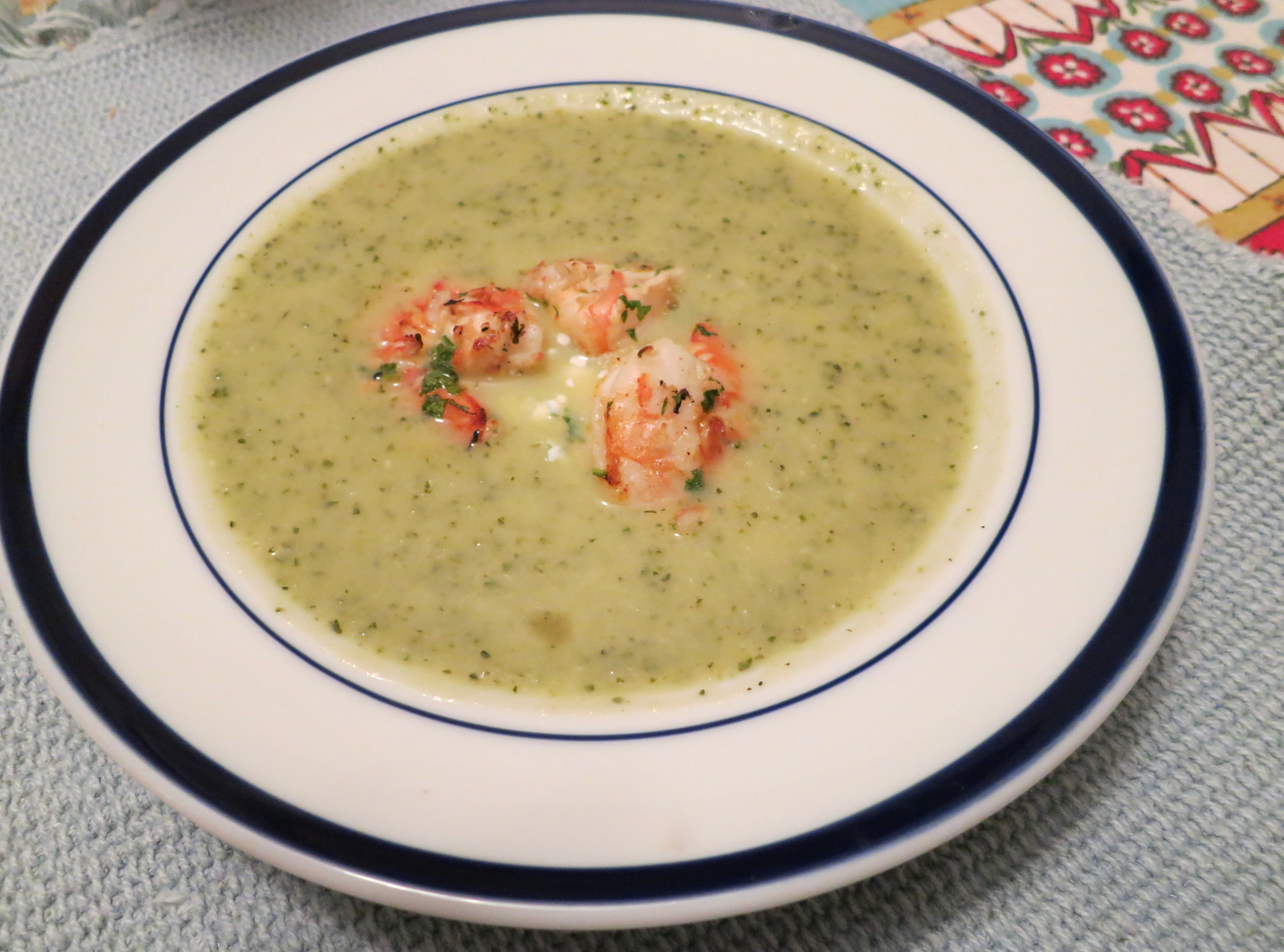 I recommend you make all of this ahead of time, earlier in the day or even the day before if you are serving at lunch, including the grilled shrimp. Build time in for the soup to cool before you put it in the processor (I would give it an hour).