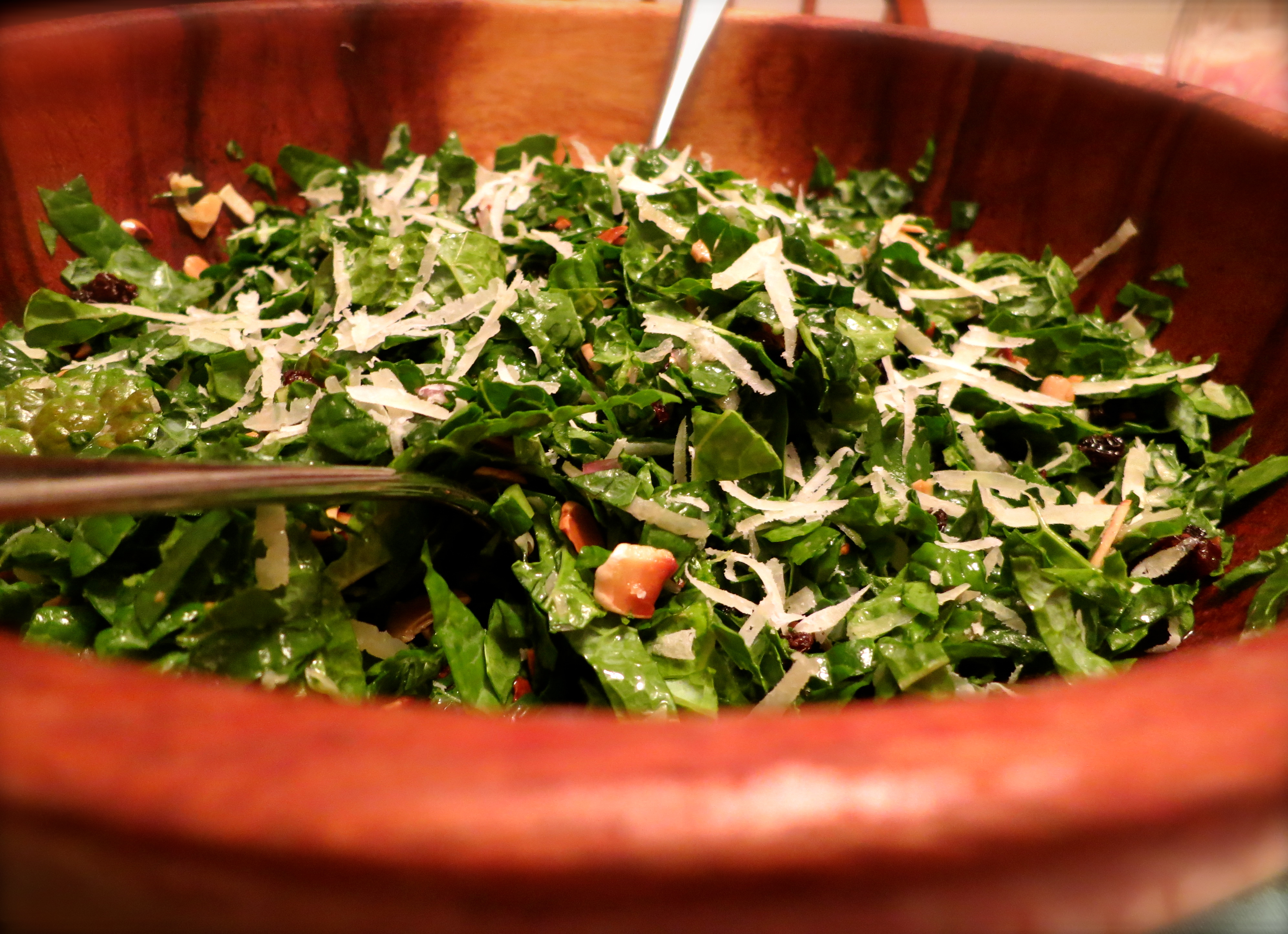 - Chop tuscan kale and place in salad bowl. Shred aged manchego over salad and add currants.