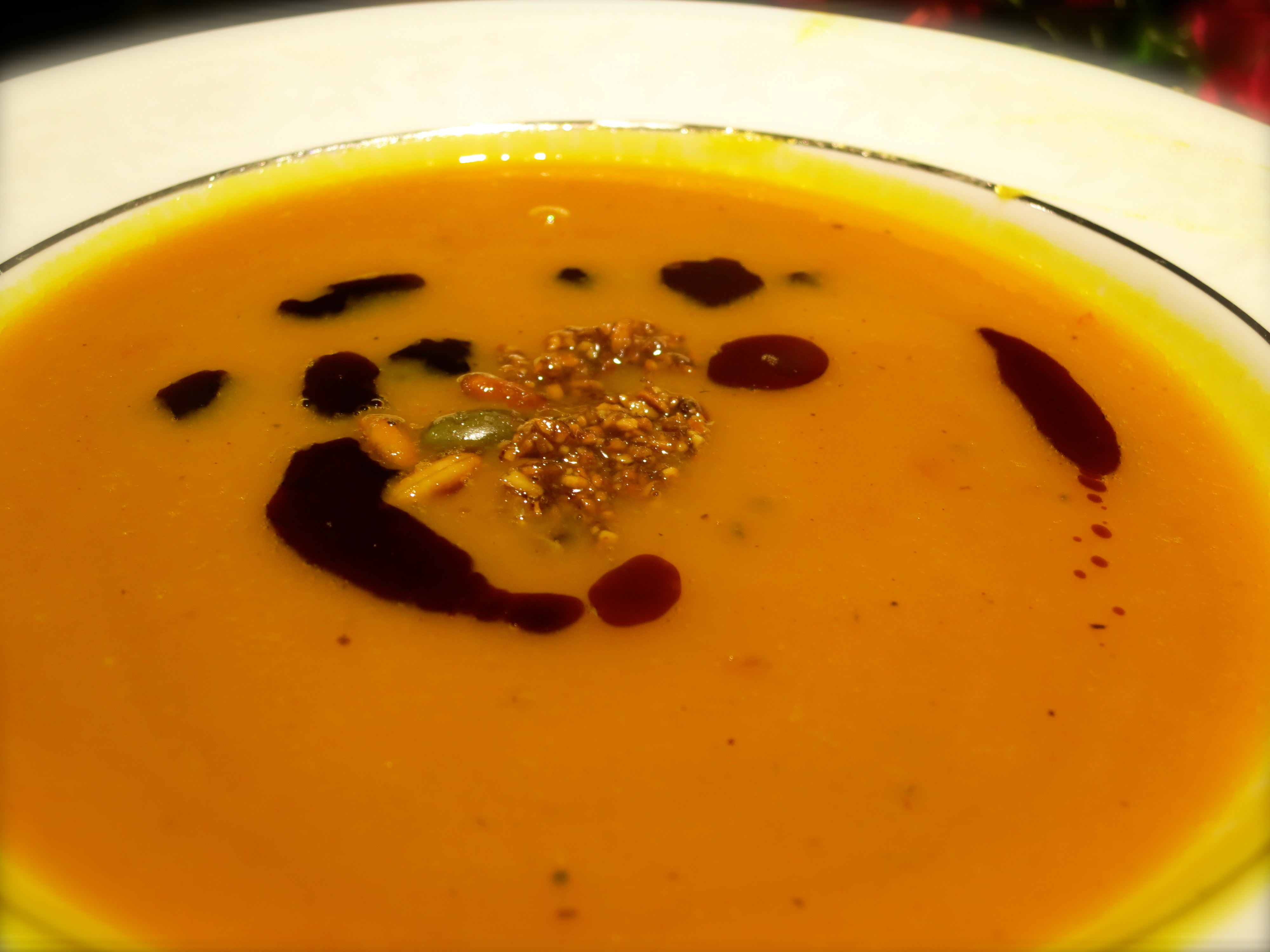 - Working in batches, puree the soup in a blender. Return it to the saucepan, rewarm and season with salt, cayenne and fresh ground pepper. Ladle the soup into bowls and garnish with a spoonful of the pumpkin seed paste, the sugared pumpkin seeds and a drizzle of pumpkin seed oil.
