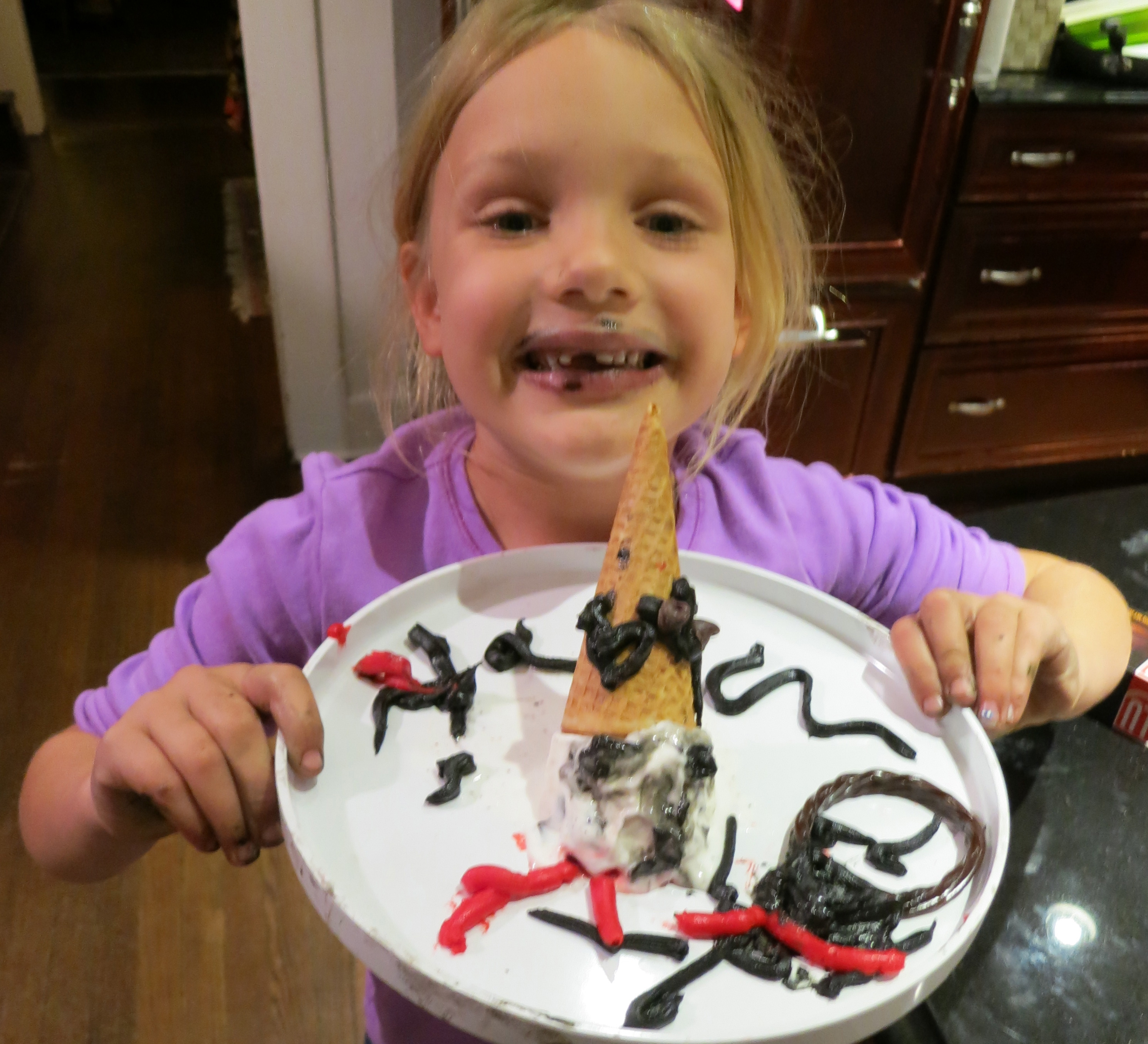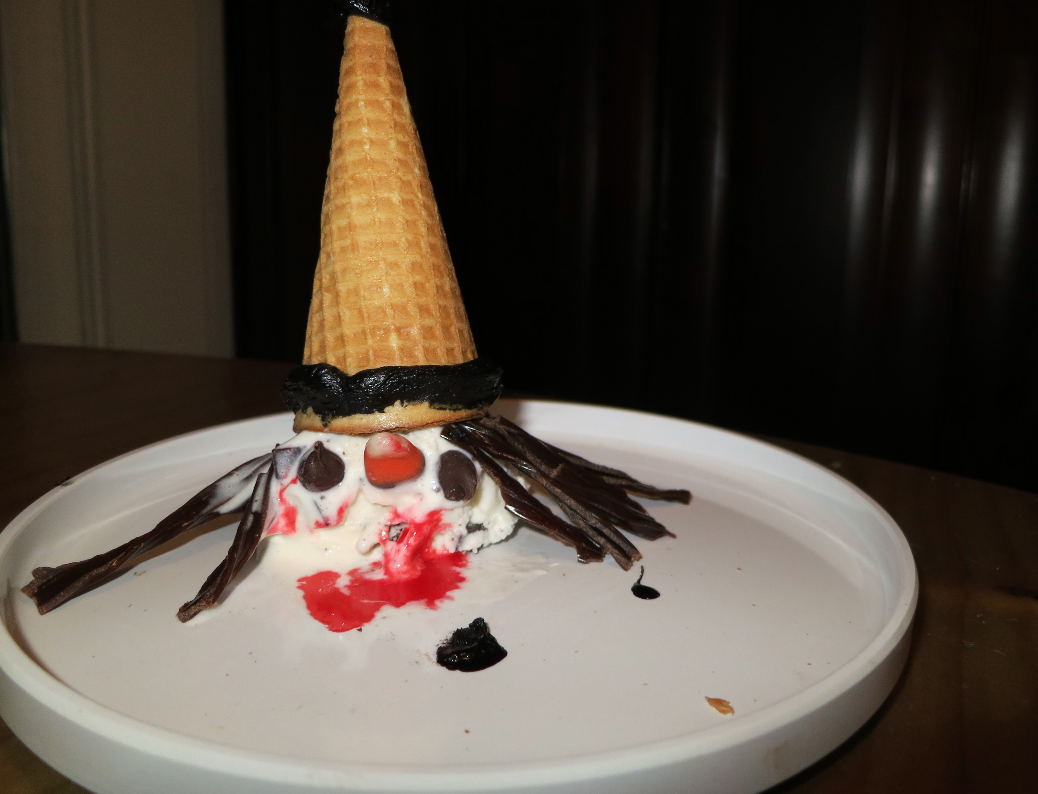 “Now, how do you make it? First, get a scoop of ice cream that is very cold and put it on a big plate. Next, get an icecream cone and draw on it with black icing. Make black eyes and a mouth on the ice cream scoop, with blood dripping down a chin with a skeleton next to it.”