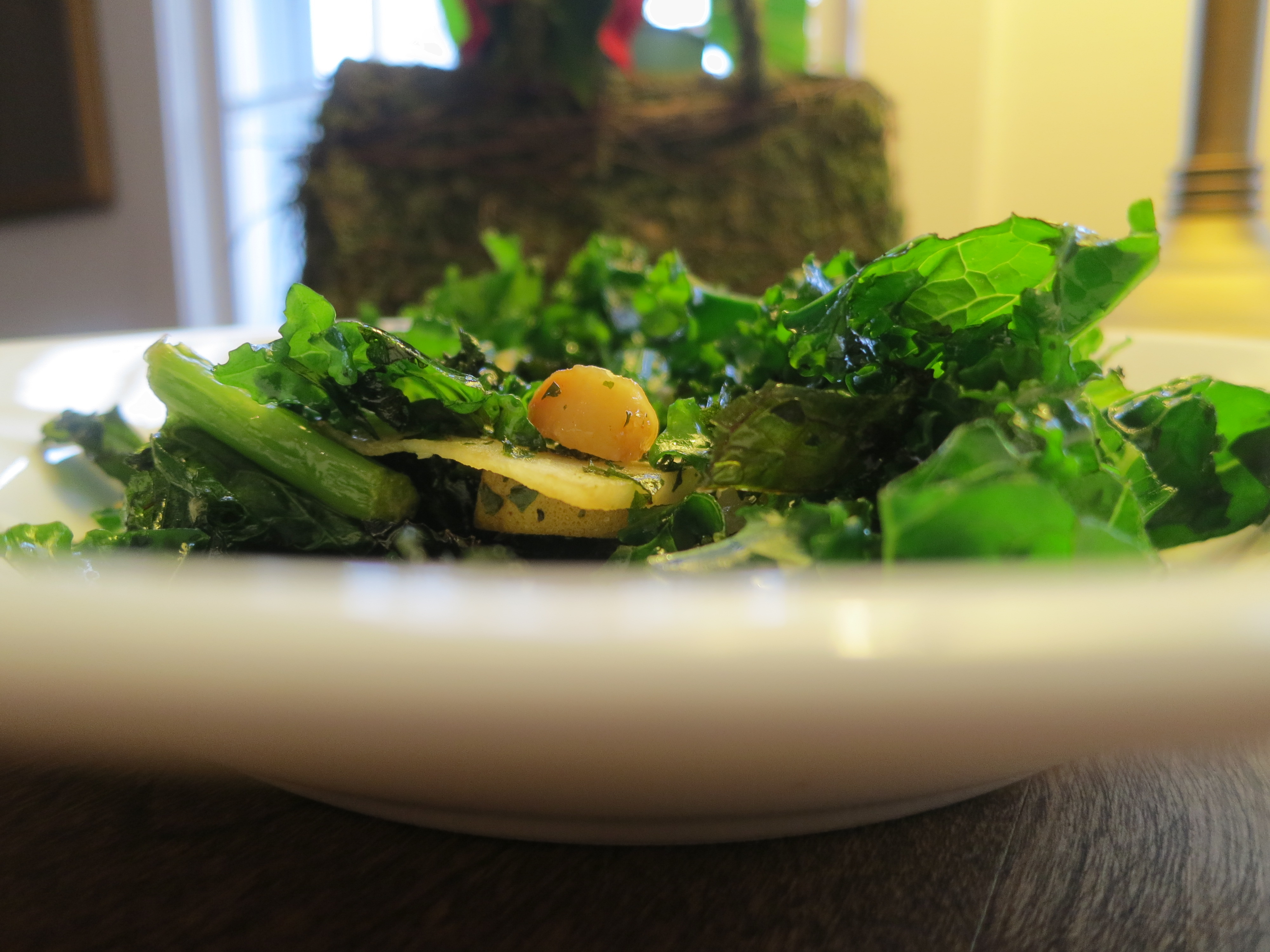 - Right before serving, toss in the baked kale chips.