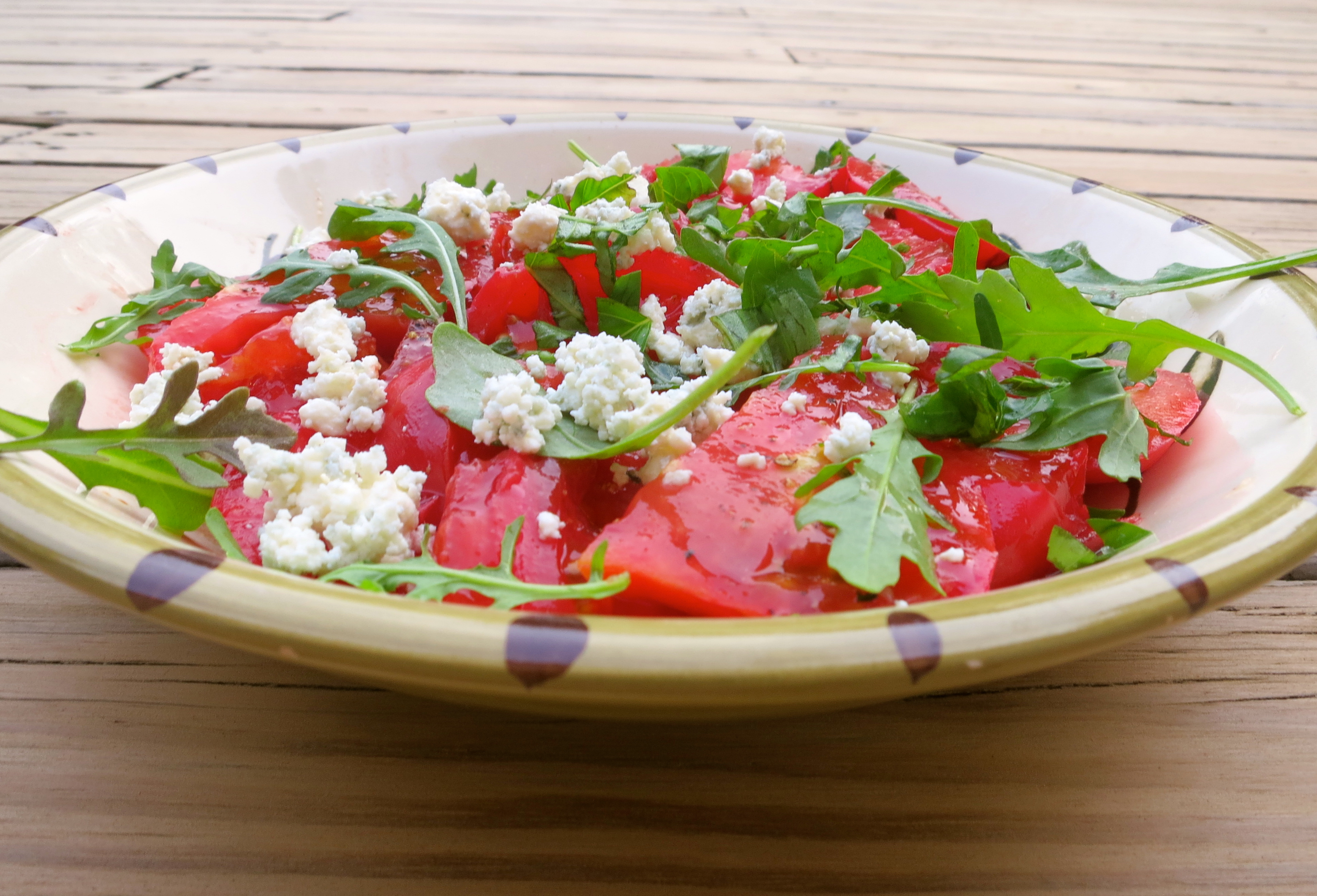 Slice the Heirloom thick, pour a dressing of balsamic vinegar, oil, salt and pepper over it, and top it with a sprinkling of fresh basil, arugula and a mild blue cheese. It’s easy, and it brings out the phenomenal flavor of those end of summer tomatoes.