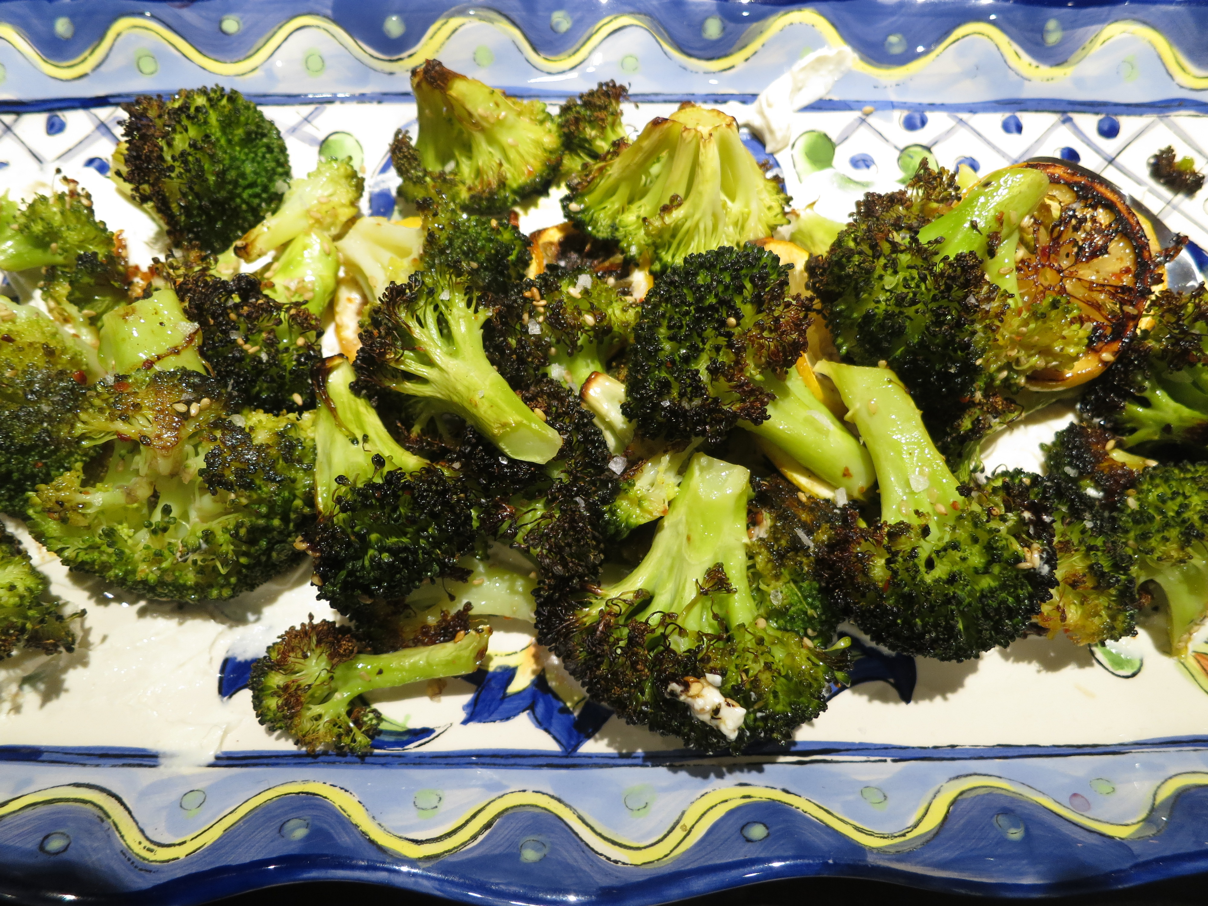 The yogurt tahini dressing comprised of yogurt, tahini, garlic and lemon juice is mixed in just a few minutes and can be made hours to a day or two ahead of time. You can also prep the broccoli tossed with lemon rinds, olive oil, crushed red pepper (I use Aleppo) and salt on your baking sheet an hour or two before you put it in the oven. From my perspective, those are key things to have in a side dish you are preparing for a dinner party. This dish is prepped before guests arrive, can go in the oven for a mere 20 minutes after your main dish has come out. It then goes straight from the oven to a serving plate artistically spread with the tahini yogurt dressing. It’s oh so pretty and totally delish!