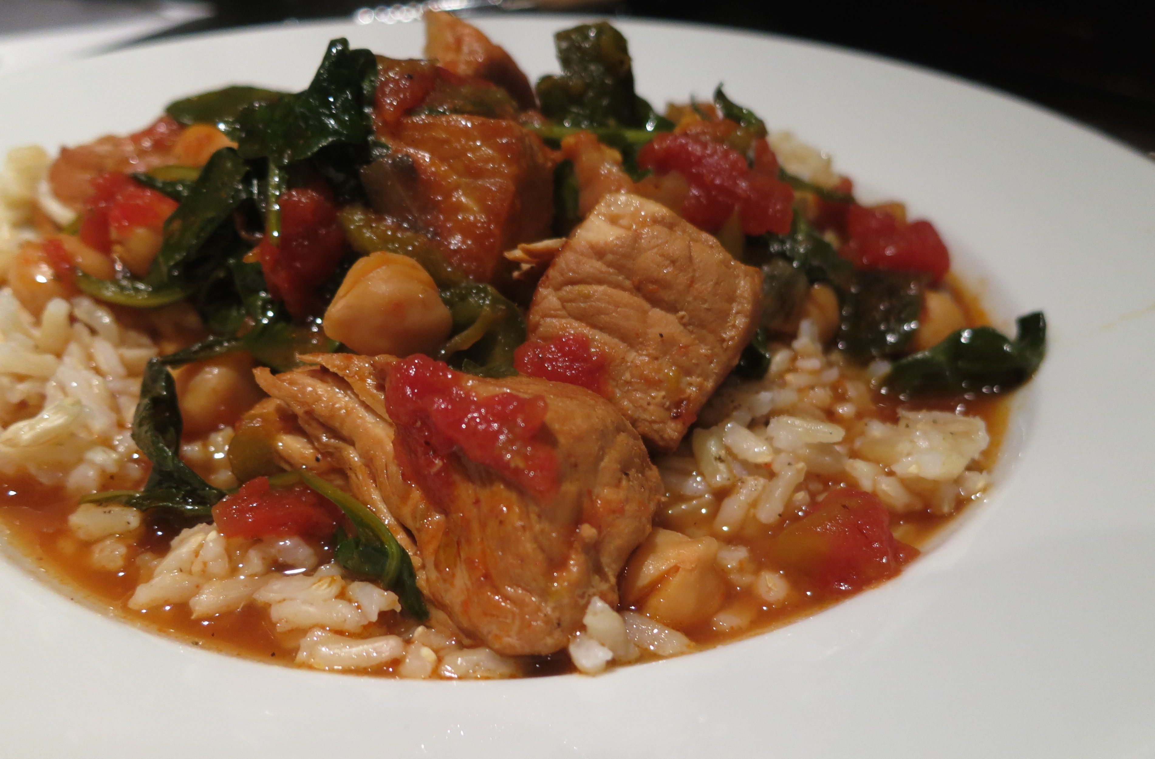 So this recipe is a pure original and takes inspiration from a variety of Mexican pork stews. I made it up on Friday night and tried it stovetop with only an hour of simmer. The flavors were unbelievable, but the pork needed more time. So Monday was the day where I had the time to think ahead and hit Whole Foods early in the day for the pork stew meat and the poblano and jalepeno peppers and garbanzo beans and diced tomatoes. I doubled the amount of meat I used on Friday night figuring a reheatable stew would be a good thing to have around during the work week. I threw the meat and peppers in a pot with onion, garlic and a bunch of funky seasoning and a little white wine (there seemed to be ample open bottles in my house this weekend). And let it simmer for hours in the slow cooker. And then towards the end I threw in some baby kale and made an arugula salad and some brown rice. The stew was topped with some sour cream and cilantro.