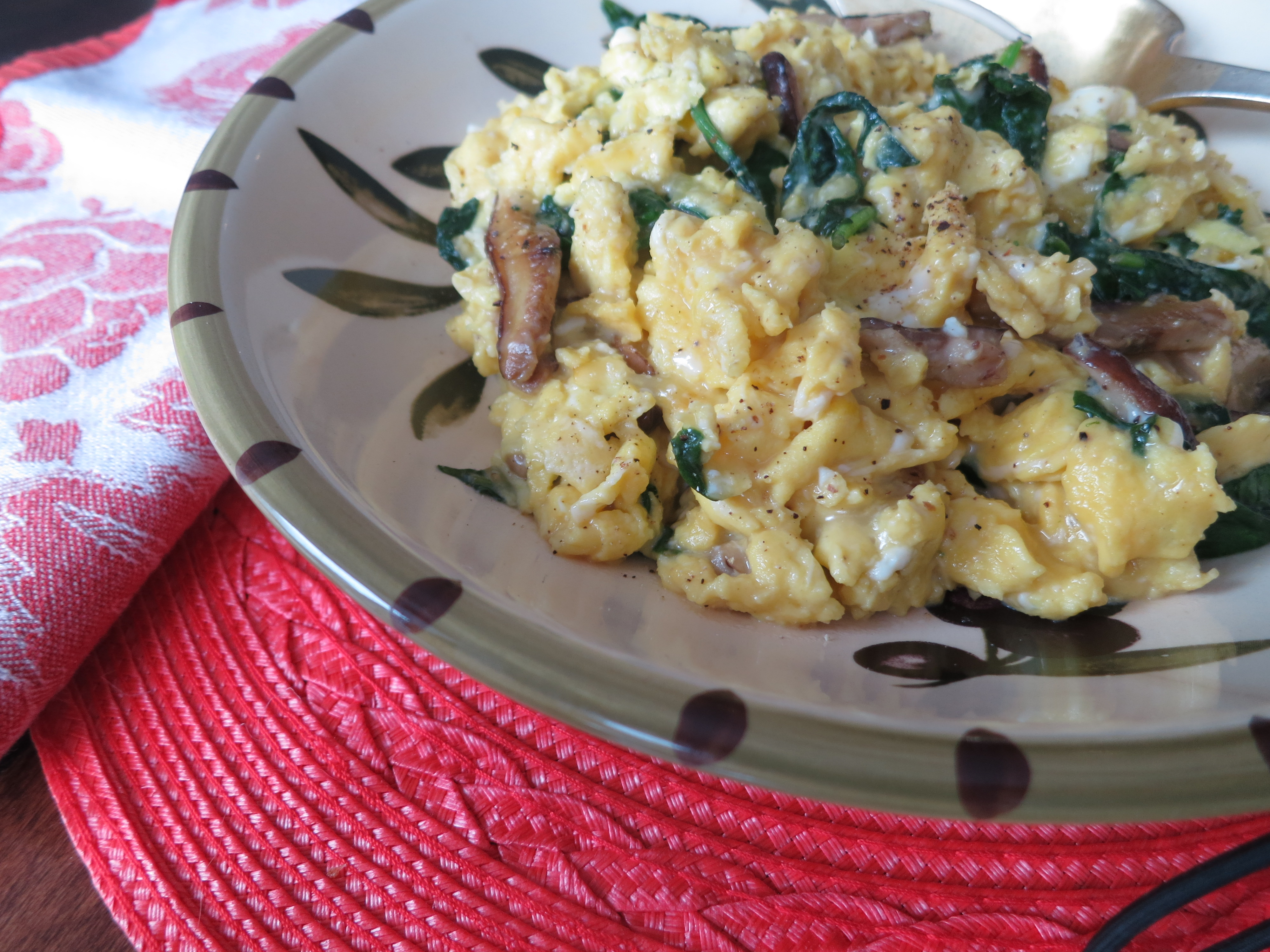 I start by sauteing shitake mushrooms in a little olive oil until they begin to soften and brown. Next I add in some power green like spinach, baby kale or swiss chard (or better yet a mixture of all three). Then I remove the pan from the heat and scoop the vegetables to a plate. I reduce the heat to medium low, add just a little more olive oil to the pan and slowly cook the scrambies, scooping from the outside in of the pan with a wooden spoon or spatula. Note: it is very important to keep the heat low as you cook the eggs. It will take a little longer, but the eggs will be soft and creamy, not browned and dry.