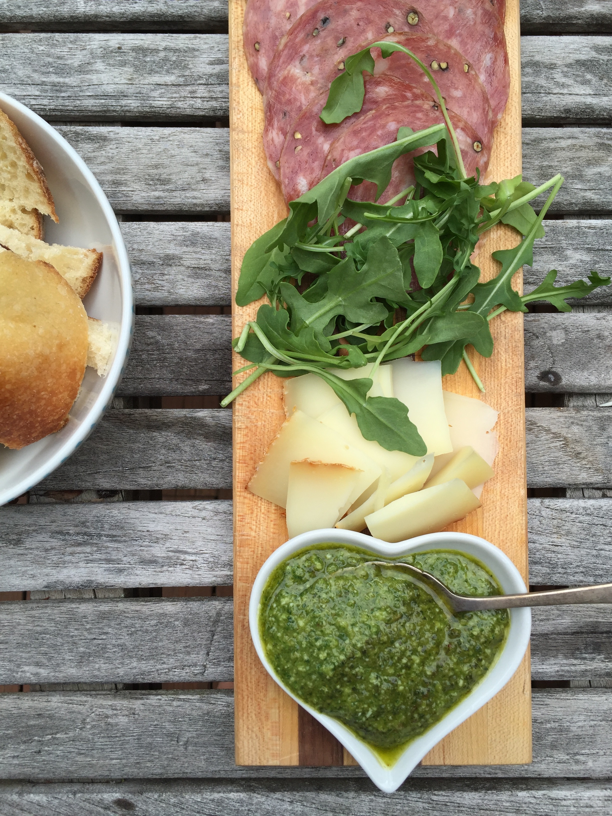 The great thing about this pesto is its utility. Sophie prefers it on its own with assorted fixings of fresh bread (dip and devour) and arugula, manchego cheese and soppressata (wrap and roll).