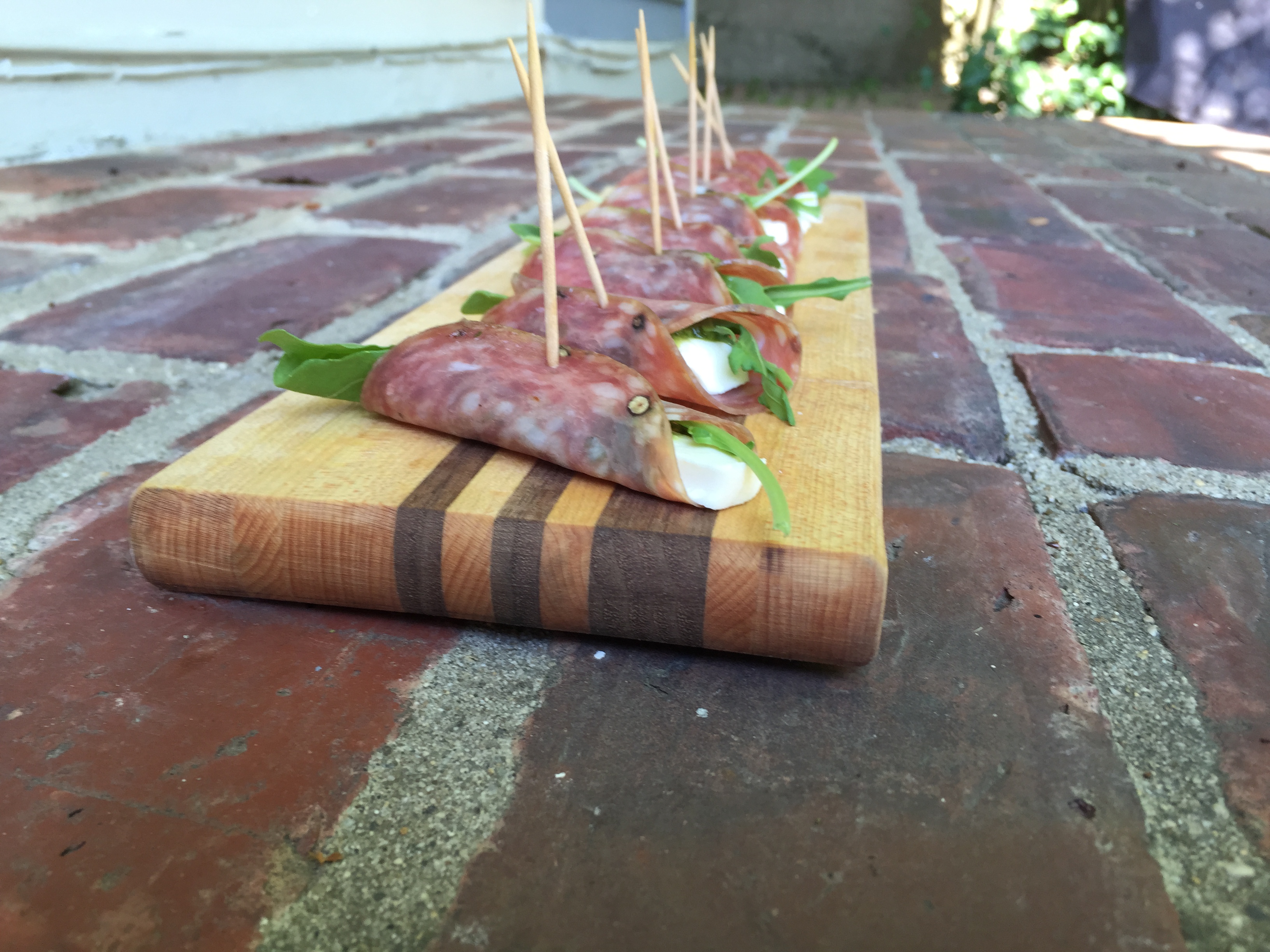 If you want to get fancy, jazz it up by rolling a little arugula, mozzarella and the pesto inside a thinly sliced piece of soppresata.