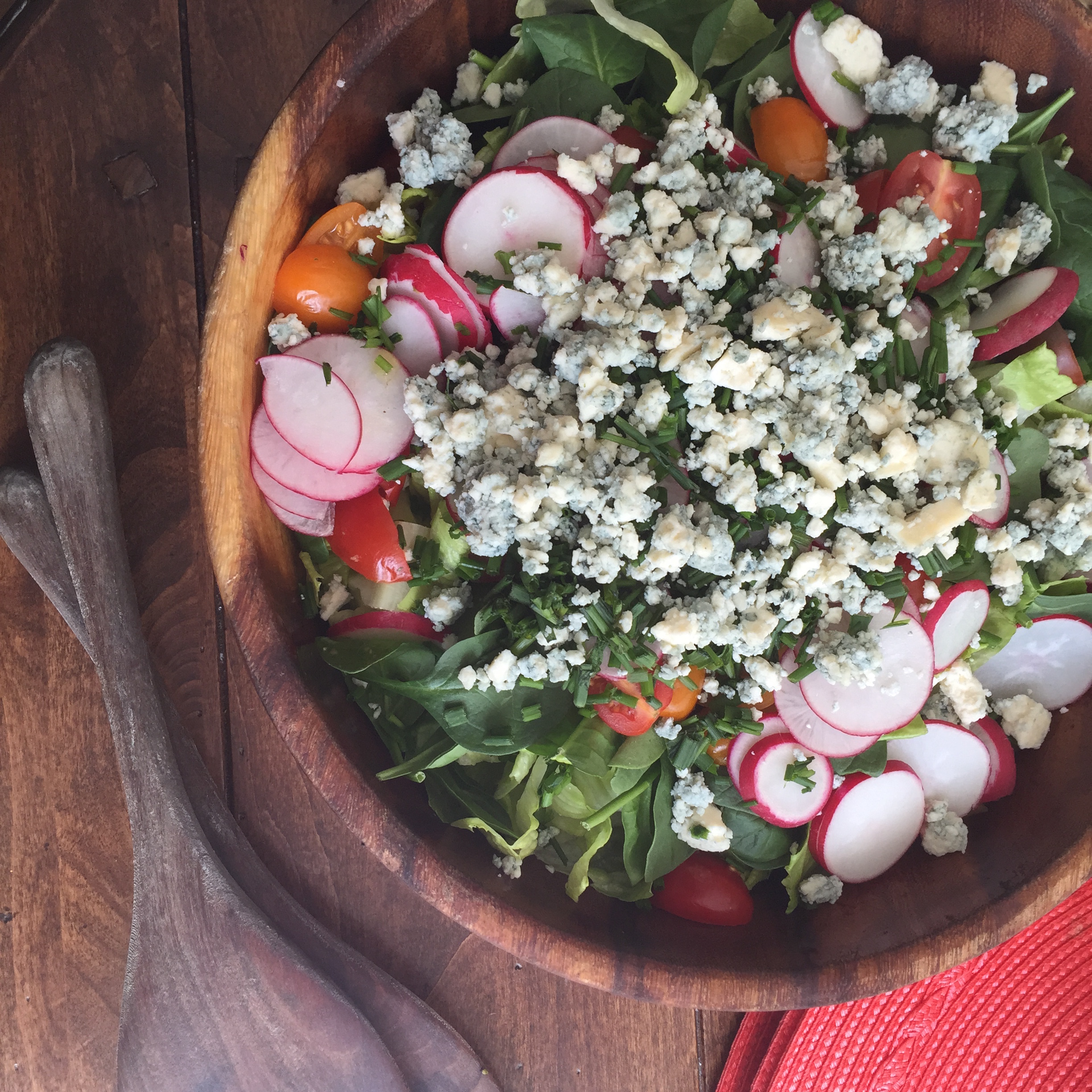 - Assemble greens, blue cheese, radishes, tomatoes and chives in a large bowl